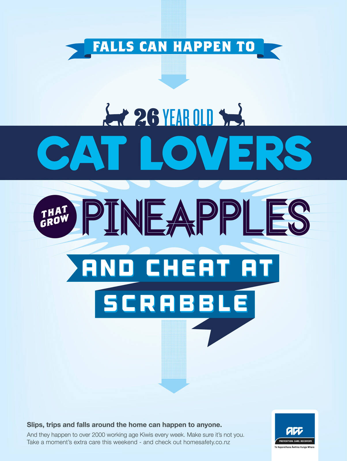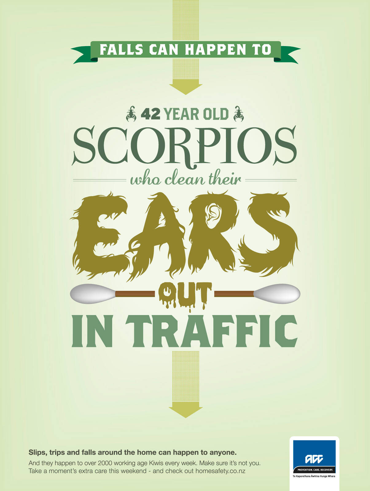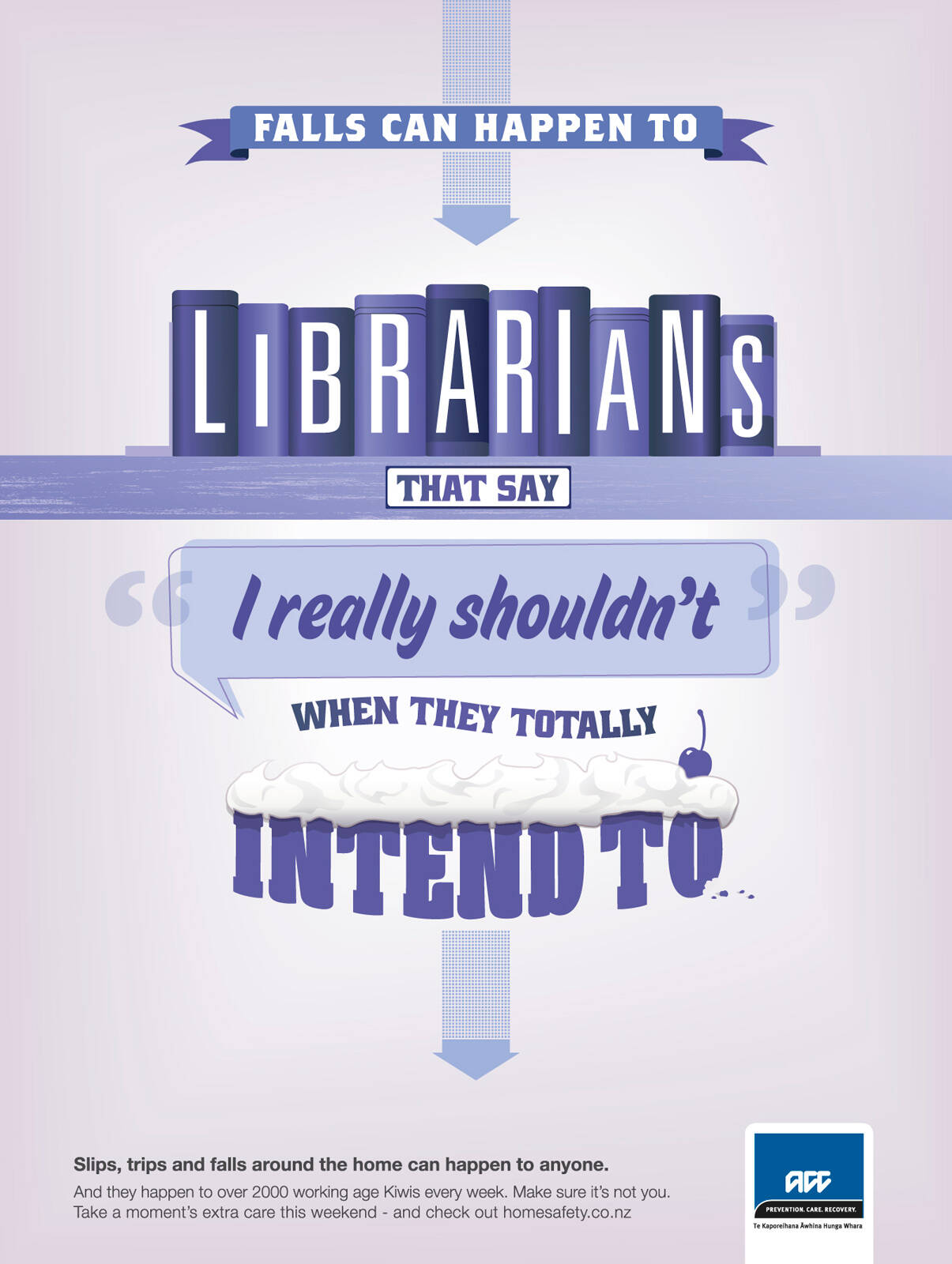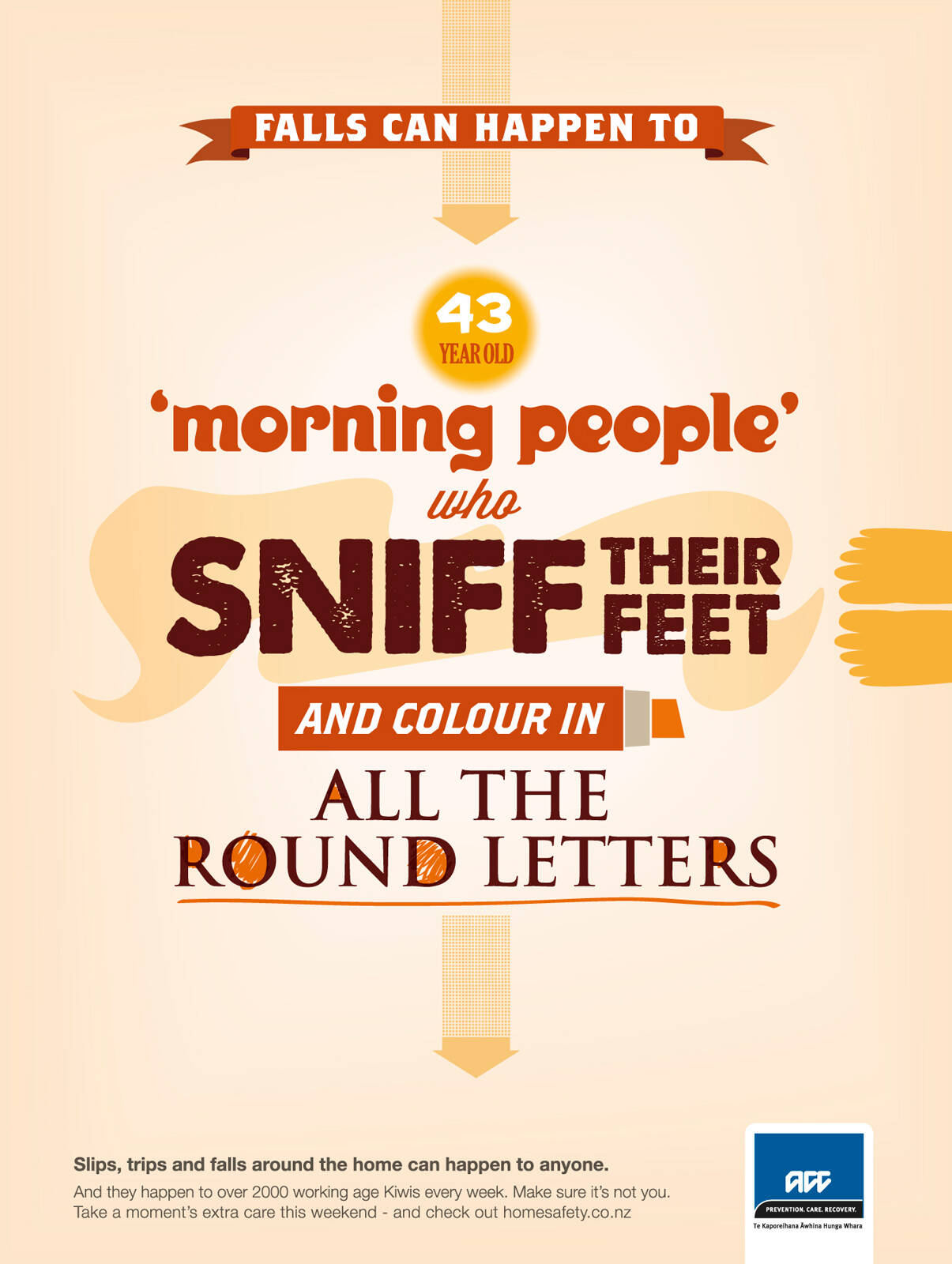 This professional campaign titled 'Falls can happen to anyone, Vitamins, Falls can happen to...' was published in New Zealand in April, 2012. It was created for the brand: Accident Compensation Corporation, by ad agency: Y&R. This Print medium campaign is related to the Finance industry and contains 6 media assets. It was submitted over 13 years ago.
