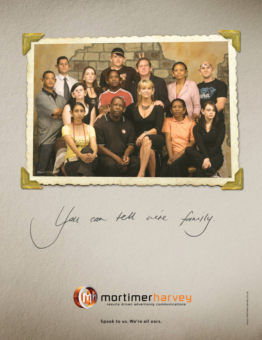 This professional campaign titled 'Family' was published in South Africa in October, 2008. It was created for the brand: Mortimer-Harvey, by ad agency: Mortimer-Harvey. This Print medium campaign is related to the Agency Self-Promo industry and contains 1 media asset. It was submitted almost 17 years ago.