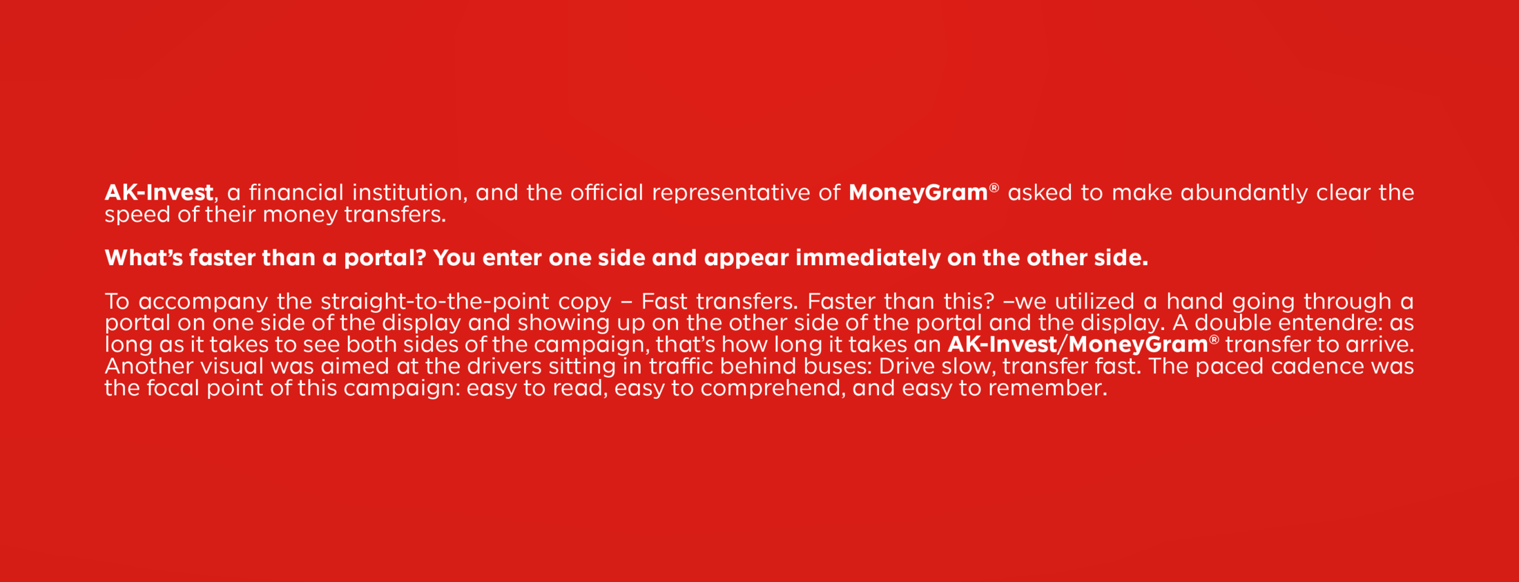 This professional campaign titled '"Faster than this?"' was published in Albania in November, 2022. It was created for the brand: AK Invest, by ad agency: BoldCrest. This OOH Outdoor medium campaign is related to the Finance industry and contains 8 media assets. It was submitted about 1 year ago.