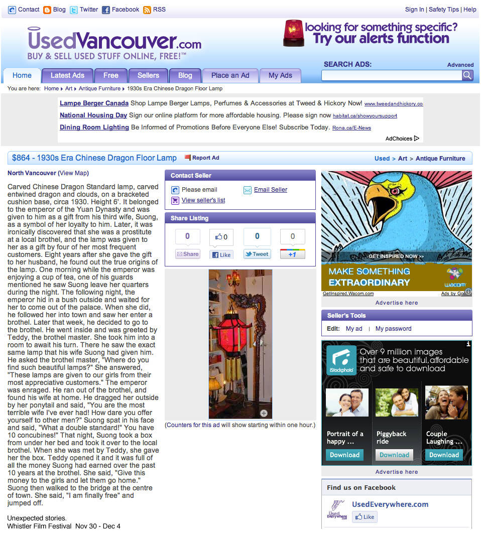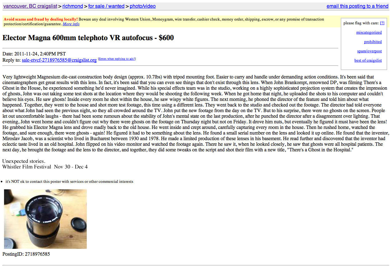 This professional campaign titled 'Fax, Pizza flyer, UsedVancouver, Kijiji, Craigslist, Rezo...' was published in Canada in December, 2011. It was created for the brand: Whistler Film Festival, by ad agency: Dare. This Static Images medium campaign is related to the Recreation, Leisure industry and contains 7 media assets. It was submitted almost 14 years ago.