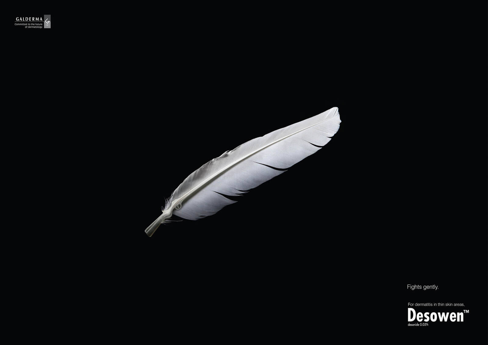 Dermatitis is an abnormal skin response to injury, allergy or infection. Dermatitis and eczema are synonymous. Desowen is a topical steroid indicated for the treatment of steroid responsive dermatoses, and treats atopic dermatitis, seborrheic dermatitis and diaper dermatitis. It is a low potency steroid application which is effective and safe to use on thin skin areas. The visual depicts a weapons merged with a feather. The feather symbolizes gentleness and the weapon depicts the effective nature of the application.Directed to doctors, the poster campaign communicates that thin skin areas need to be handled with care and Desowen being a low potency steroid with effective results is their best choice.