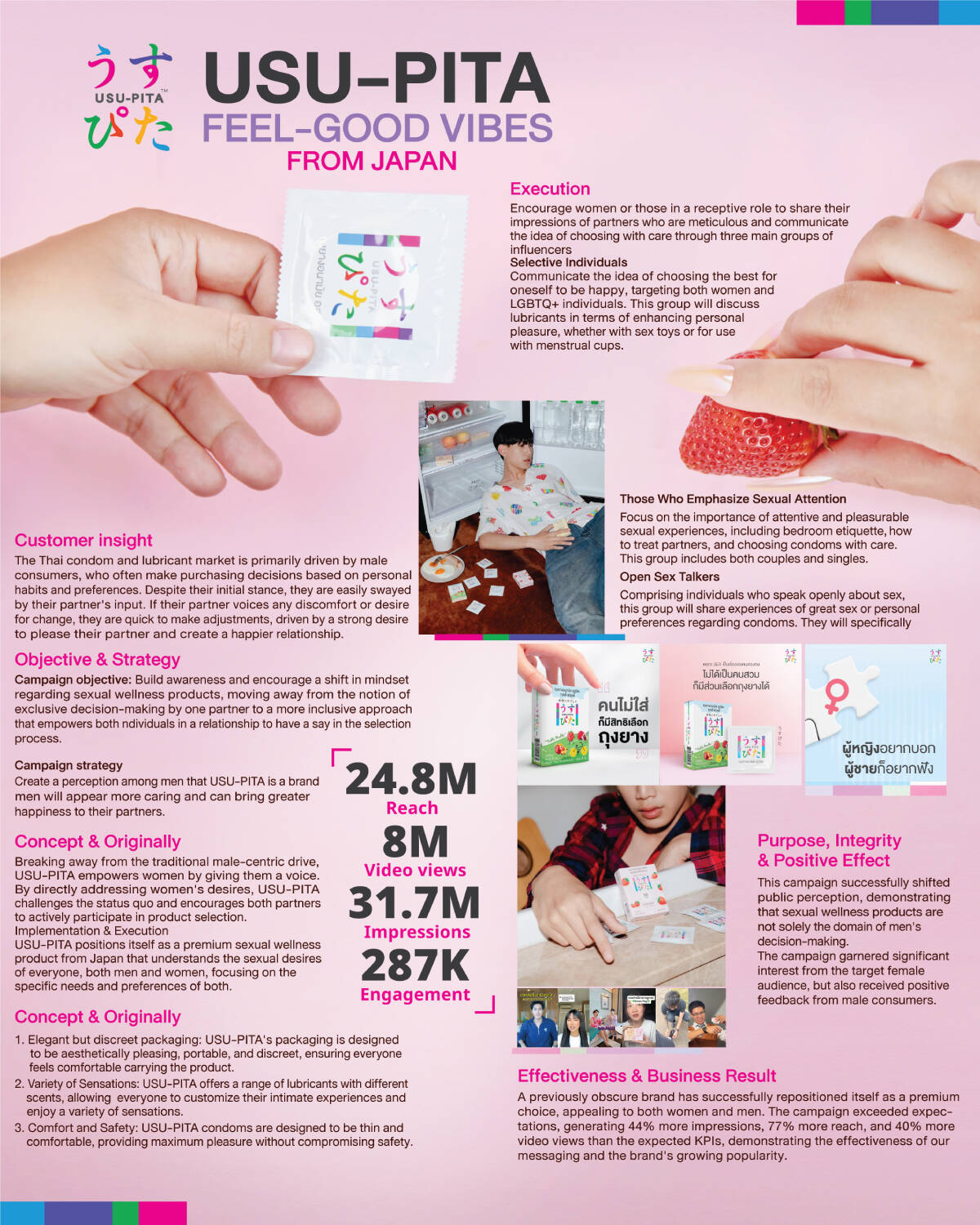 This professional campaign titled 'FEEL-GOOD VIBES FROM JAPAN' was published in Thailand in October, 2024. It was created for the brand: USU-PITA, by ad agency: Createx House. This Content and Digital media campaign is related to the Health industry and contains 5 media assets. It was submitted about 1 year ago by Creative Manager: Arjaree Mungbang of Createx House.