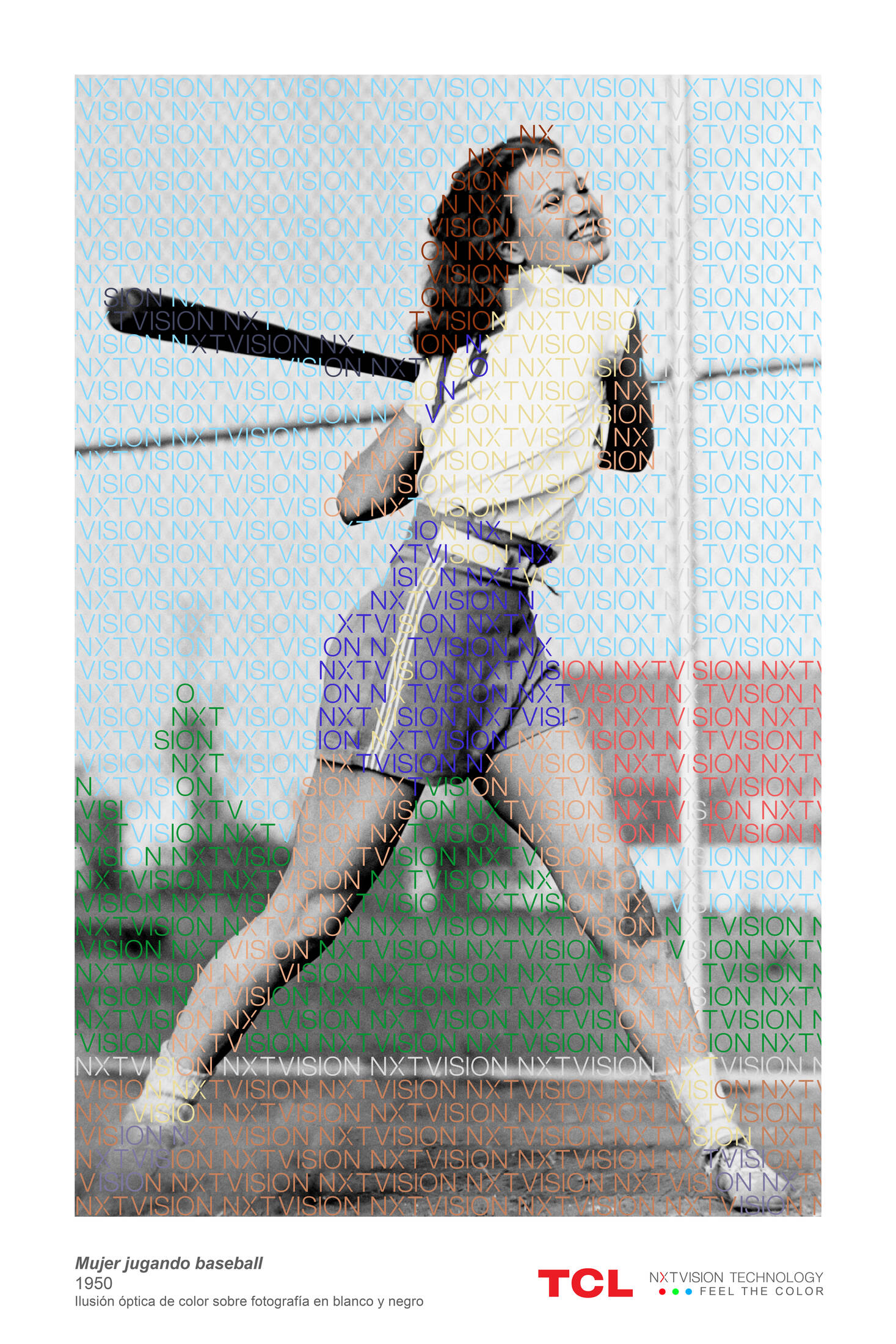 "Woman playing baseball" / 1950 / Optical illusion of color over a black and white photography.