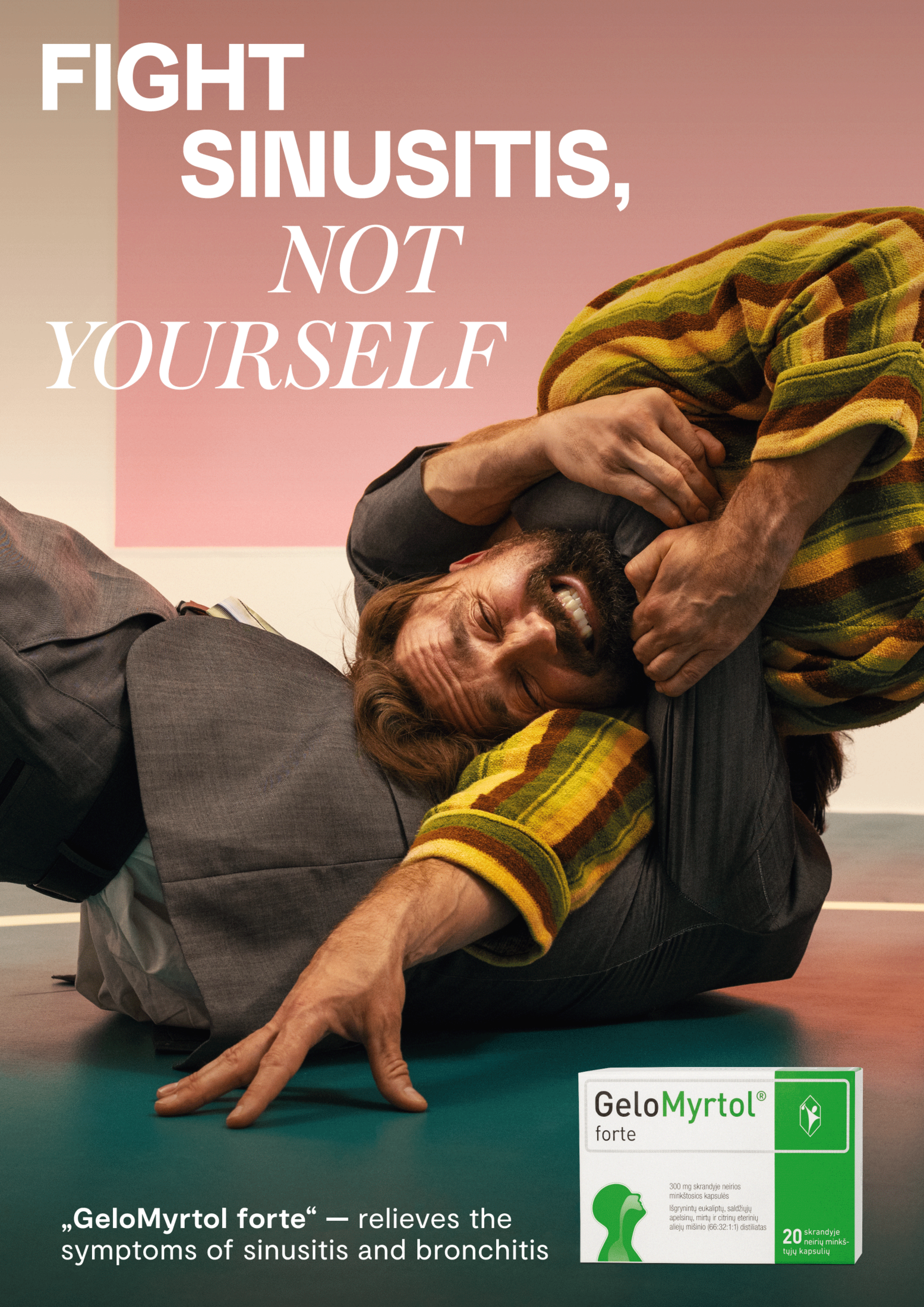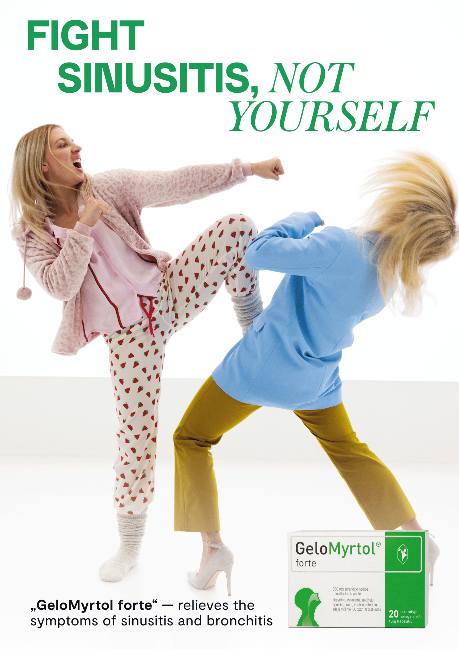 This professional campaign titled 'Fight sinusitis, not yourself' was published in Lithuania in November, 2021. It was created for the brands: Gelomyrtol and GeloRevoice, by ad agency: Autoriai. This Film, OOH Outdoor, and Print media campaign is related to the Health and Pharmaceutical industries and contains 4 media assets. It was submitted about 3 years ago by art director: Monika of autoriai | creative agency.
