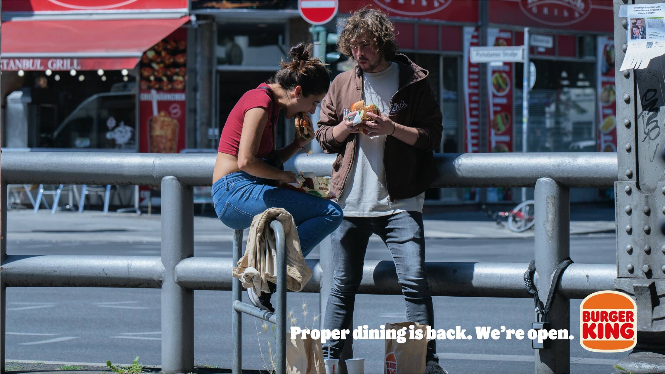 Due to the pandemic, Burger King had to close their indoor diners, so customers had to improvise and find creative ways of enjoying their meals. The brand captured those moments and created a campaign for their reopening after lockdown, inviting everyone to eat properly again. The billboards were launched in Berlin, Hamburg and Frankfurt and were expanded to Social Media platforms.