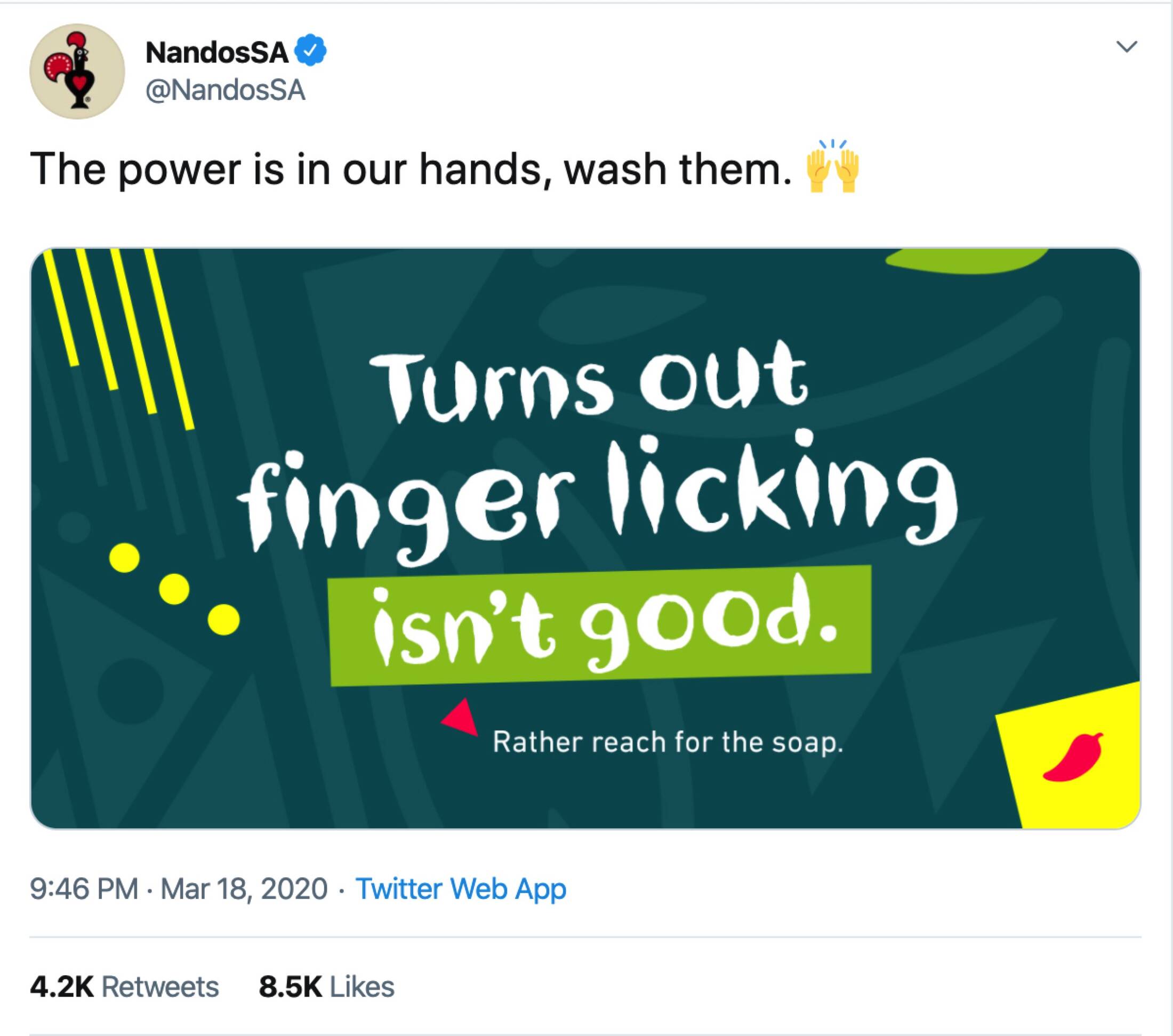 This professional campaign titled 'Finger linking isn't good' was published in South Africa in March, 2020. It was created for the brand: Nando's, . This Digital medium campaign is related to the Food industry and contains 1 media asset. It was submitted over 5 years ago.