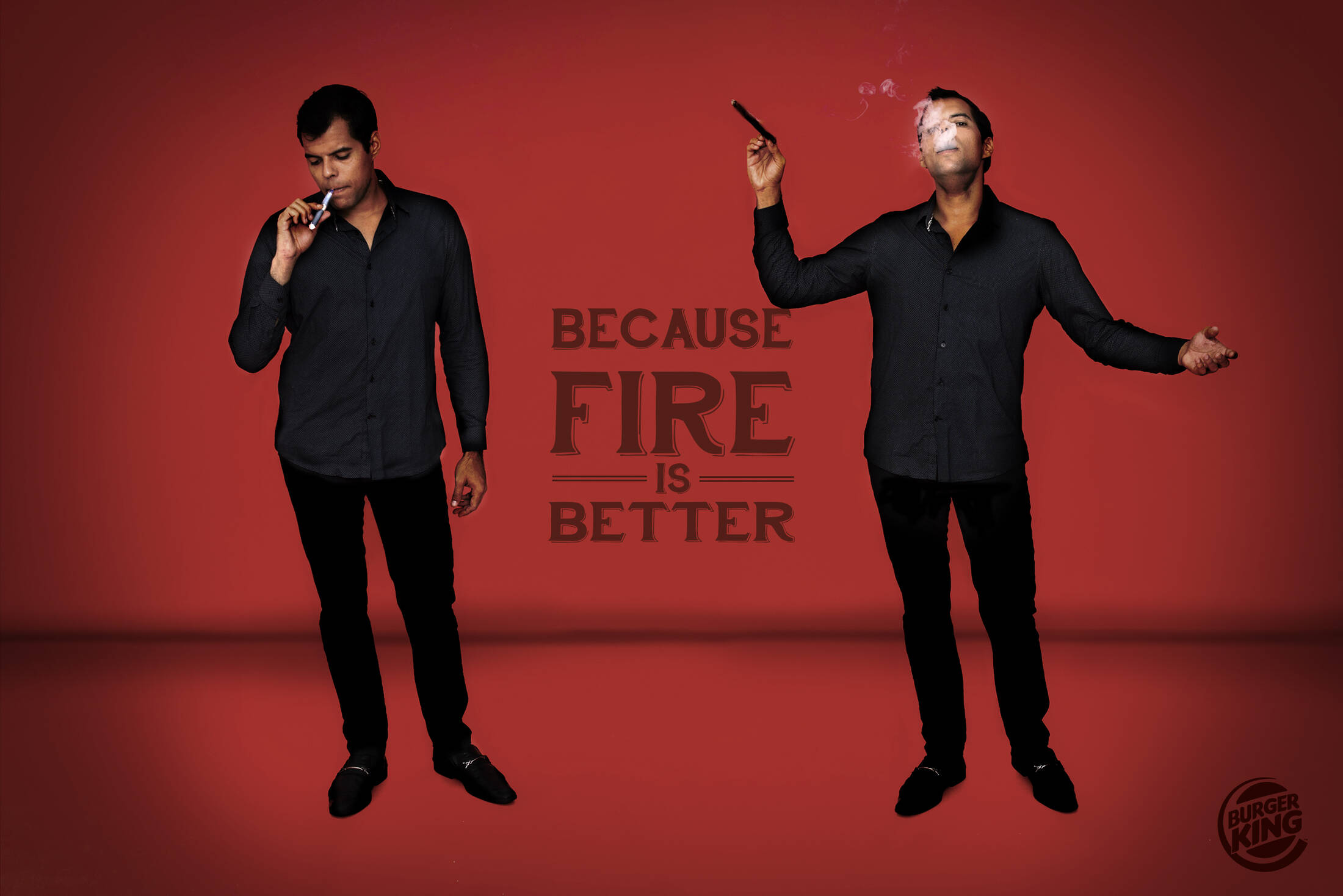 Taking into account the current position of the Burger King, we created four pieces that convey the concept "Fire is Better." The pieces seek to compare actions done with or without fire, creating an analogy with the brand positioning.