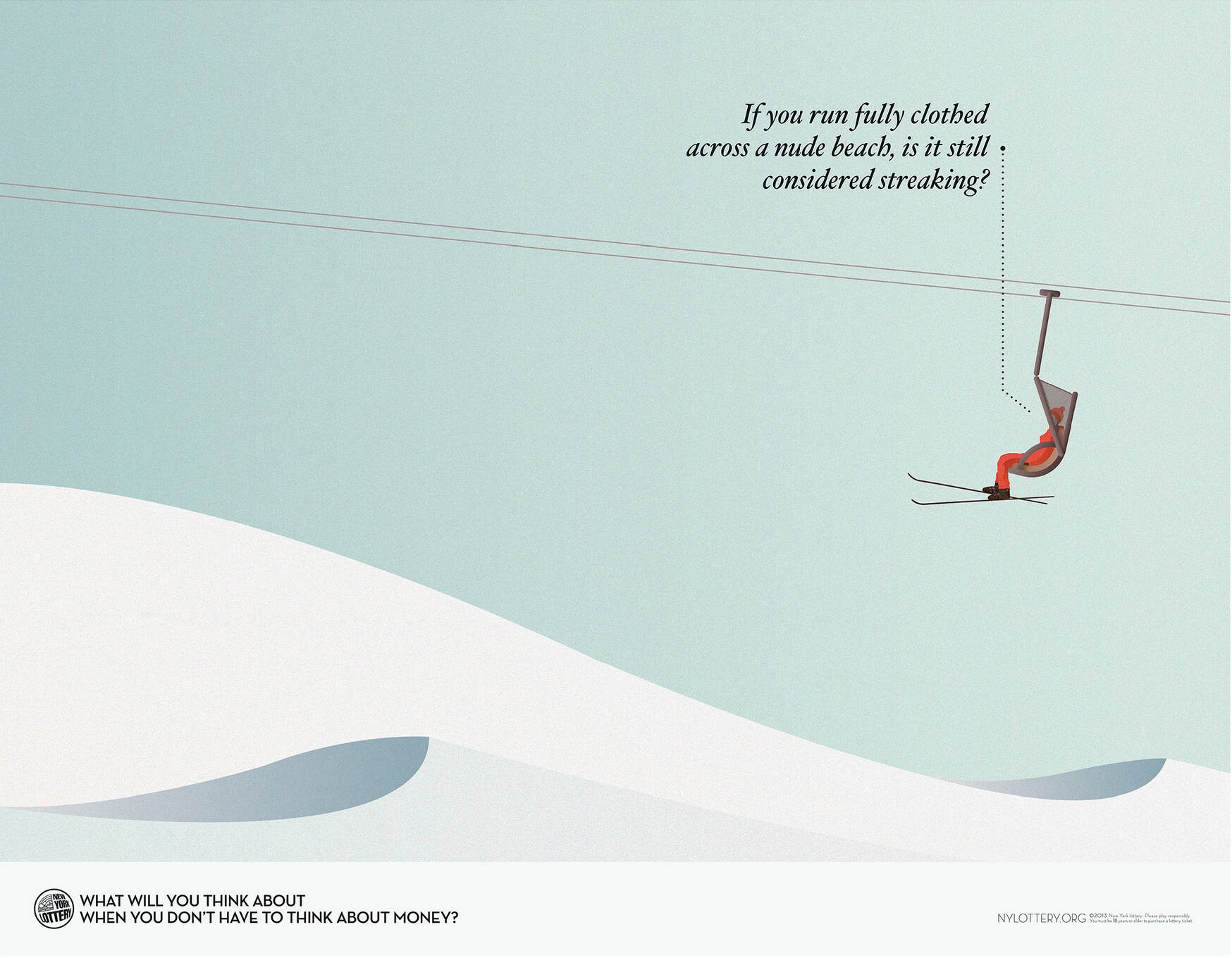 This professional campaign titled 'Fireplace, Ski, Jacuzzi, Car' was published in United States in June, 2014. It was created for the brand: New York Lottery, by ad agency: DDB. This Print medium campaign is related to the Gaming industry and contains 4 media assets. It was submitted over 11 years ago.