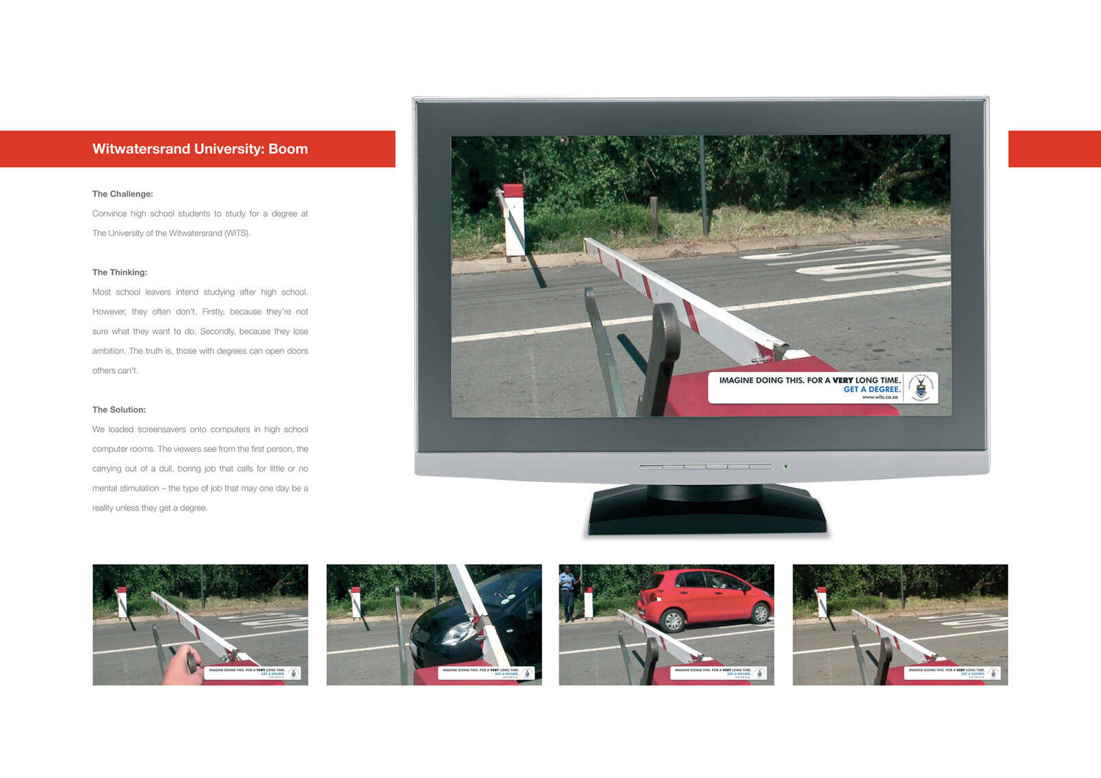 This professional campaign titled 'Flag, Boom' was published in South Africa in March, 2009. It was created for the brand: WITS, by ad agency: Saatchi & Saatchi. This Digital medium campaign is related to the Education industry and contains 2 media assets. It was submitted over 16 years ago.