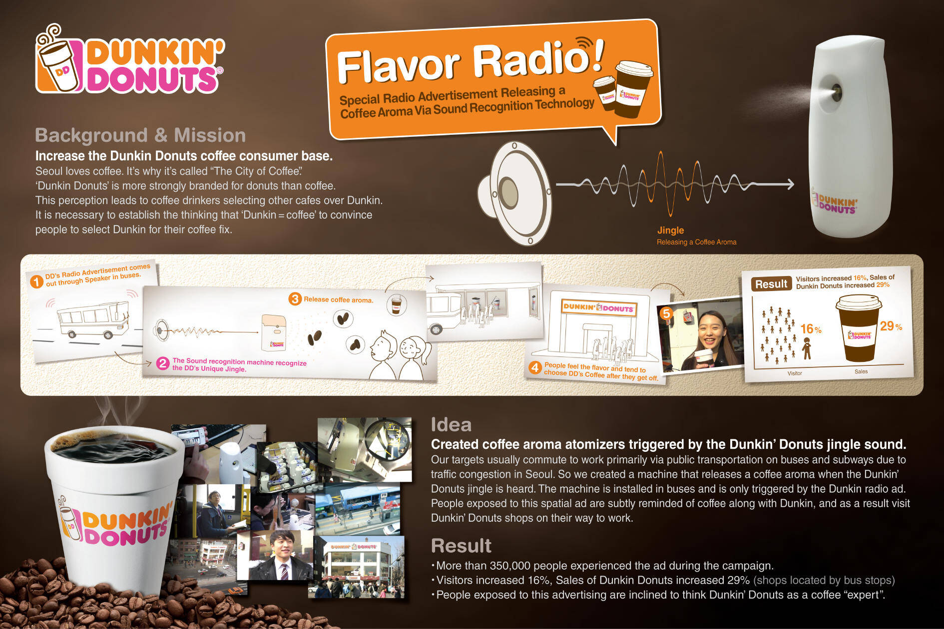 This professional campaign titled 'Flavor Radio' was published in South Korea in January, 2012. It was created for the brand: Dunkin' Donuts, by ad agency: Cheil. This Audio medium campaign is related to the Food industry and contains 1 media asset. It was submitted over 13 years ago.