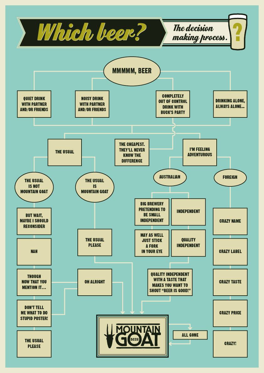 This professional campaign titled 'Flow Chart' was published in Australia in June, 2011. It was created for the brand: Mountain Goat, by ad agency: Freeform. This Print medium campaign is related to the Alcoholic Drinks industry and contains 1 media asset. It was submitted over 14 years ago.