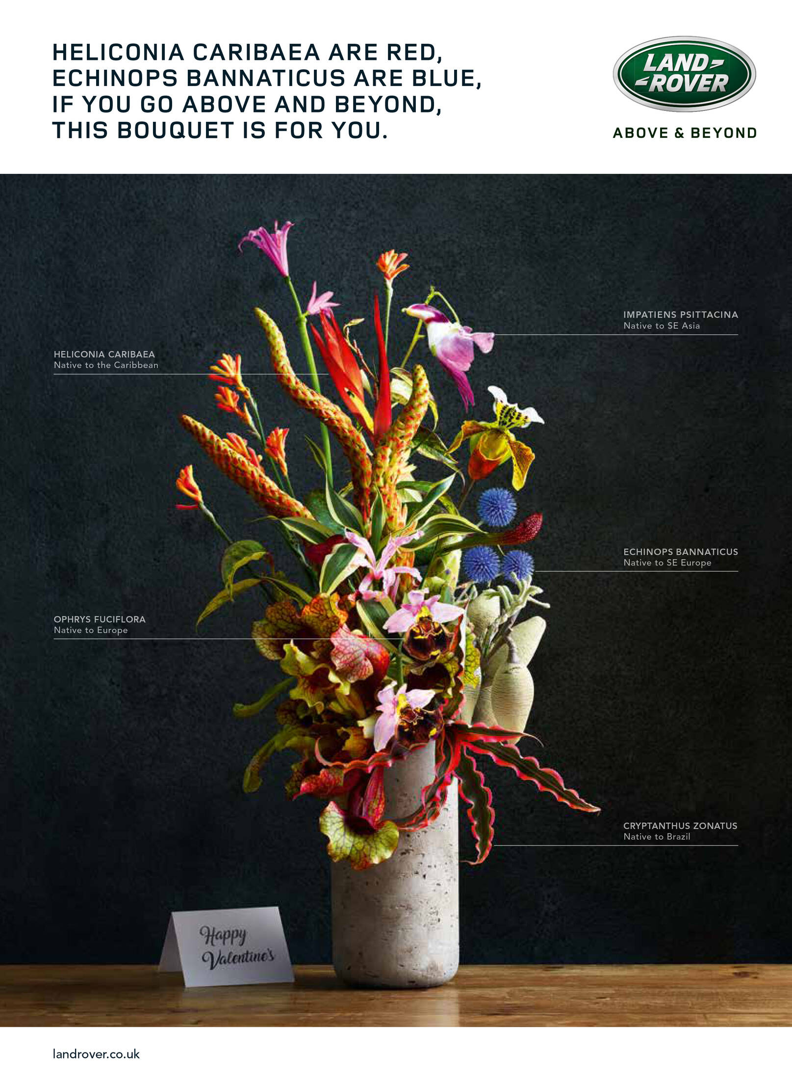 To celebrate this year's Valentine's Day, Spark44 have created a tactical print ad. It demonstrates that, while anyone can give roses, Land Rover owners can go above and beyond and collect their loved one's bouquet from the four corners of the earth.