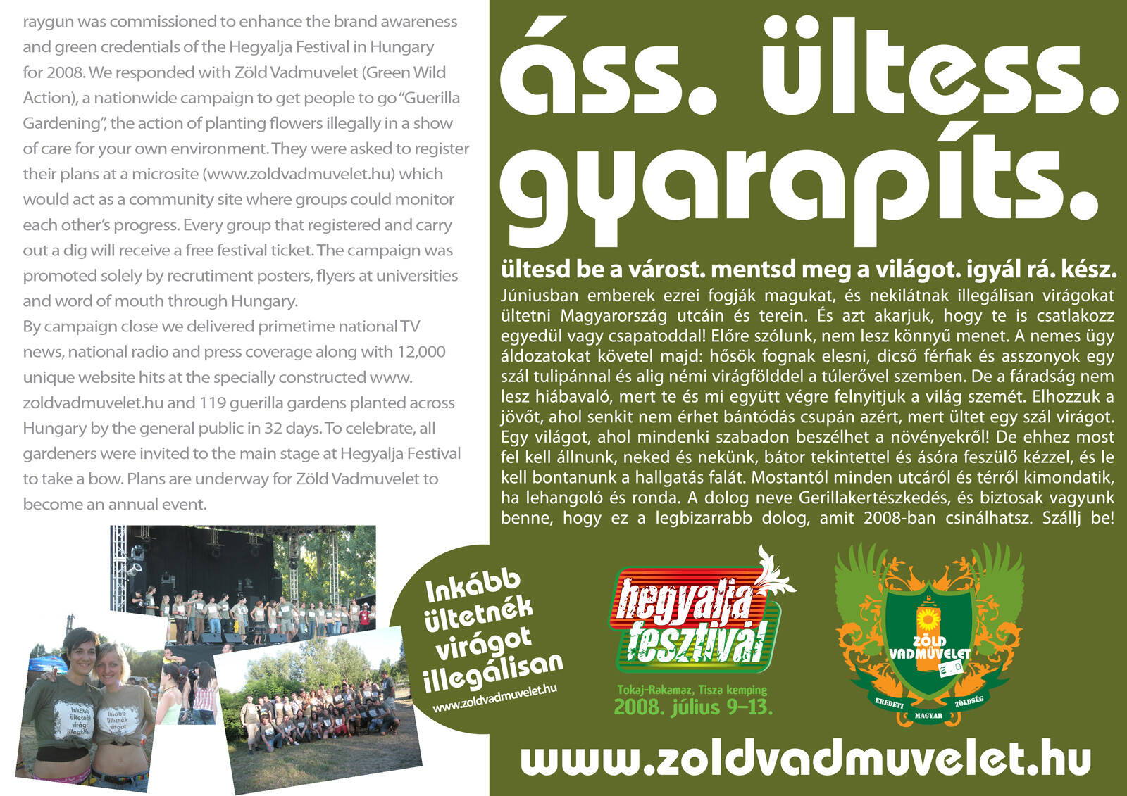 A nationwide promotion for a music festival's green credentials. We built a promotion get people to go and plant flowers illegally in towns across Hungary for a free ticket to the festival. We had 12,000 unique visitors to the microsite (http://www.zoldvadmuvelet.hu), nationwide press, and 63 teams of people who joined the promotion to go guerilla gardening. Above is recruitment poster and some user generated shots. It was created 1 year before the Adidas Grun project.