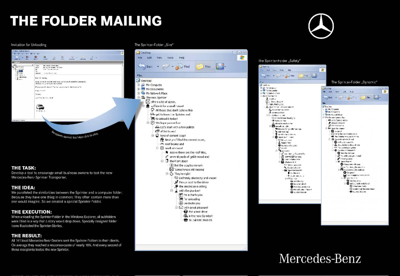 This professional campaign titled 'Folder mailing' was published in Germany in June, 2009. It was created for the brand: Mercedes, by ad agency: Lukas Lindemann Rosinski. This Static Images medium campaign is related to the Automotive and Personal Transportation industry and contains 1 media asset. It was submitted over 16 years ago.