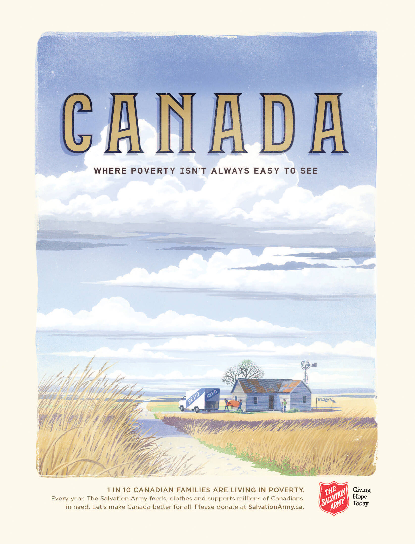 This professional campaign titled 'Food Bank, Moving, Farm, Tour Bus: Poverty Isn't Always E...' was published in Canada in July, 2017. It was created for the brand: Salvation Army, by ad agency: Grey. This Print medium campaign is related to the Public Interest industry and contains 4 media assets. It was submitted over 8 years ago.