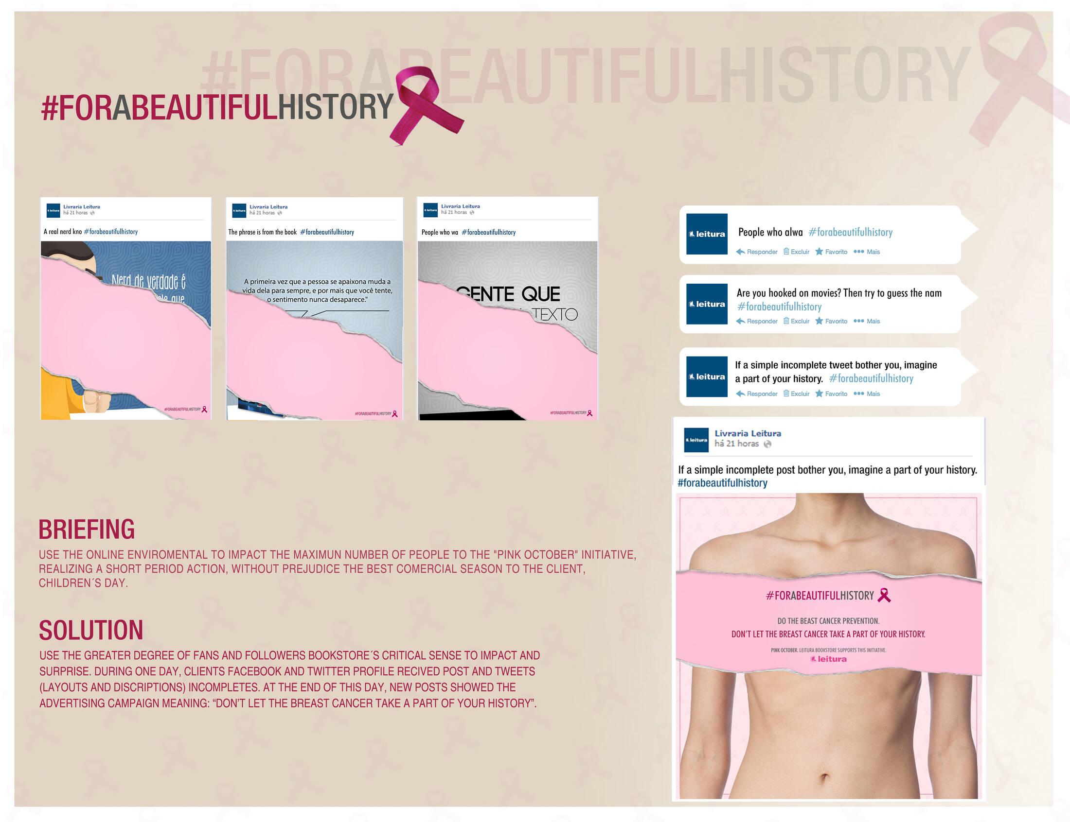 This professional campaign titled '#forabeautifulhistory' was published in Brazil in October, 2013. It was created for the brand: Leitura Bookstore, by ad agency: Making. This Digital medium campaign is related to the Recreation, Leisure industry and contains 1 media asset. It was submitted about 12 years ago.
