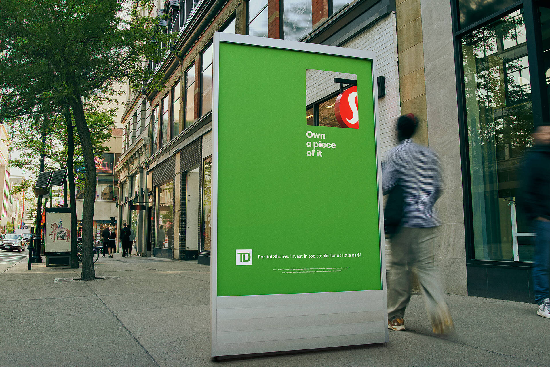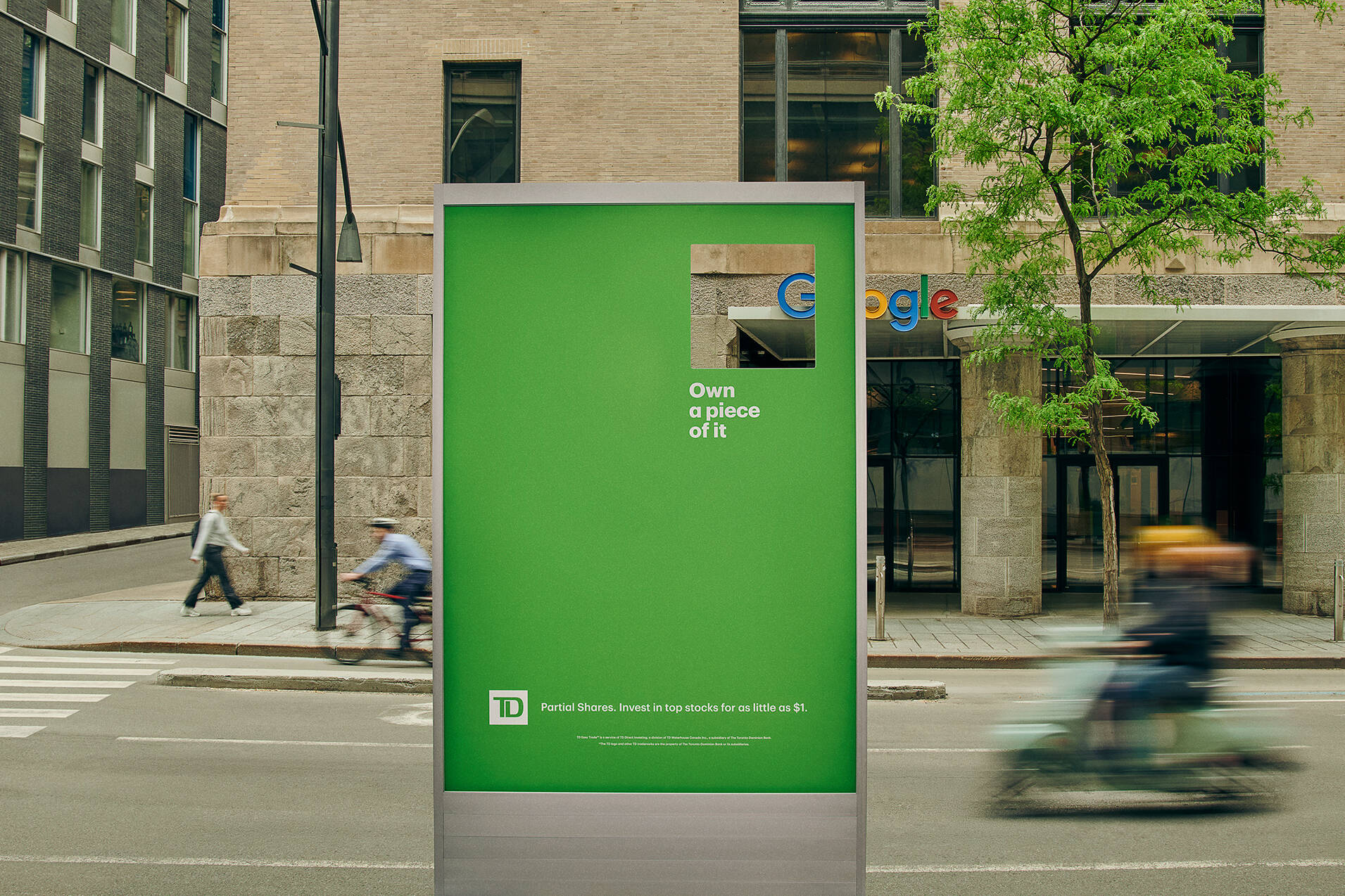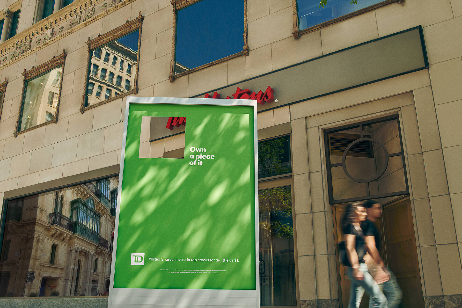 Since each logo was at a different height in its natural environment, each placement had to be positioned at the precise angle and distance. And because we were promoting Fractional Shares, we had to ensure every window would only display a fraction of the brand's logo. Each ad took people to the TD Direct investing page.