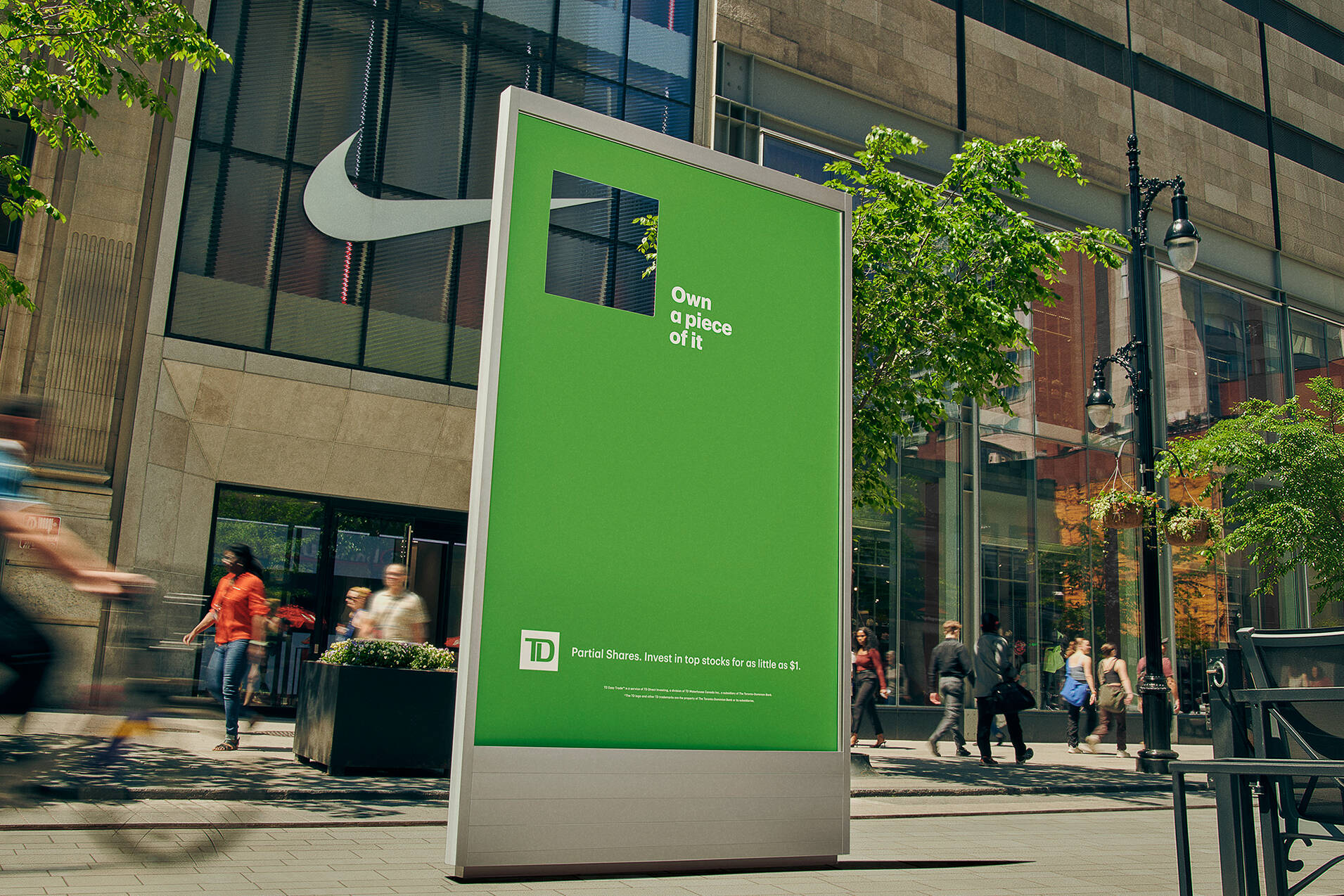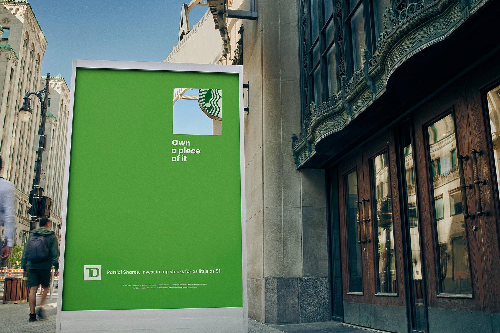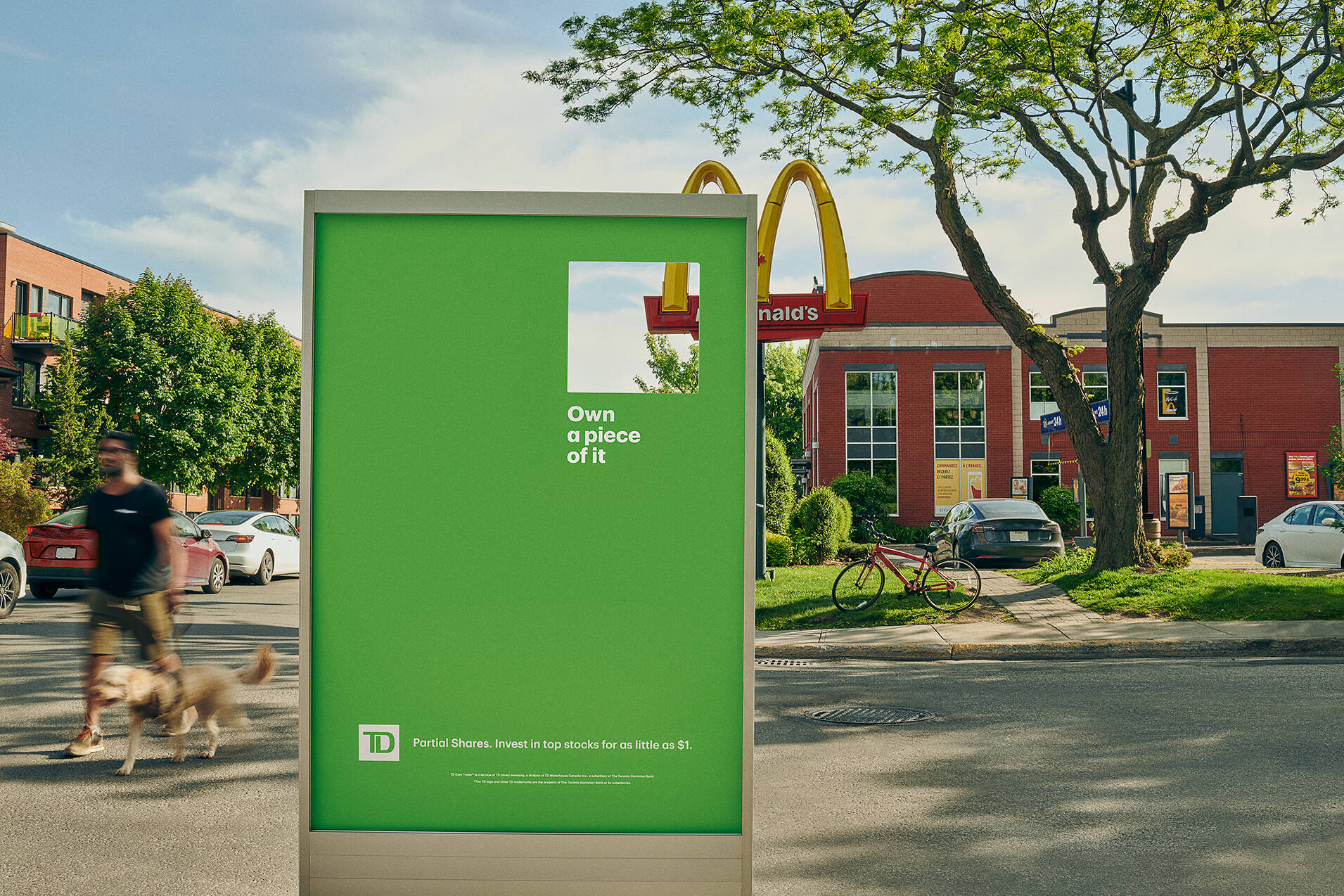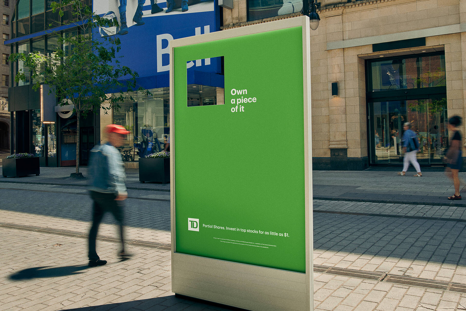 Since each logo was at a different height in its natural environment, each placement had to be positioned at the precise angle and distance. And because we were promoting Fractional Shares, we had to ensure every window would only display a fraction of the brand's logo. Each ad took people to the TD Direct investing page.