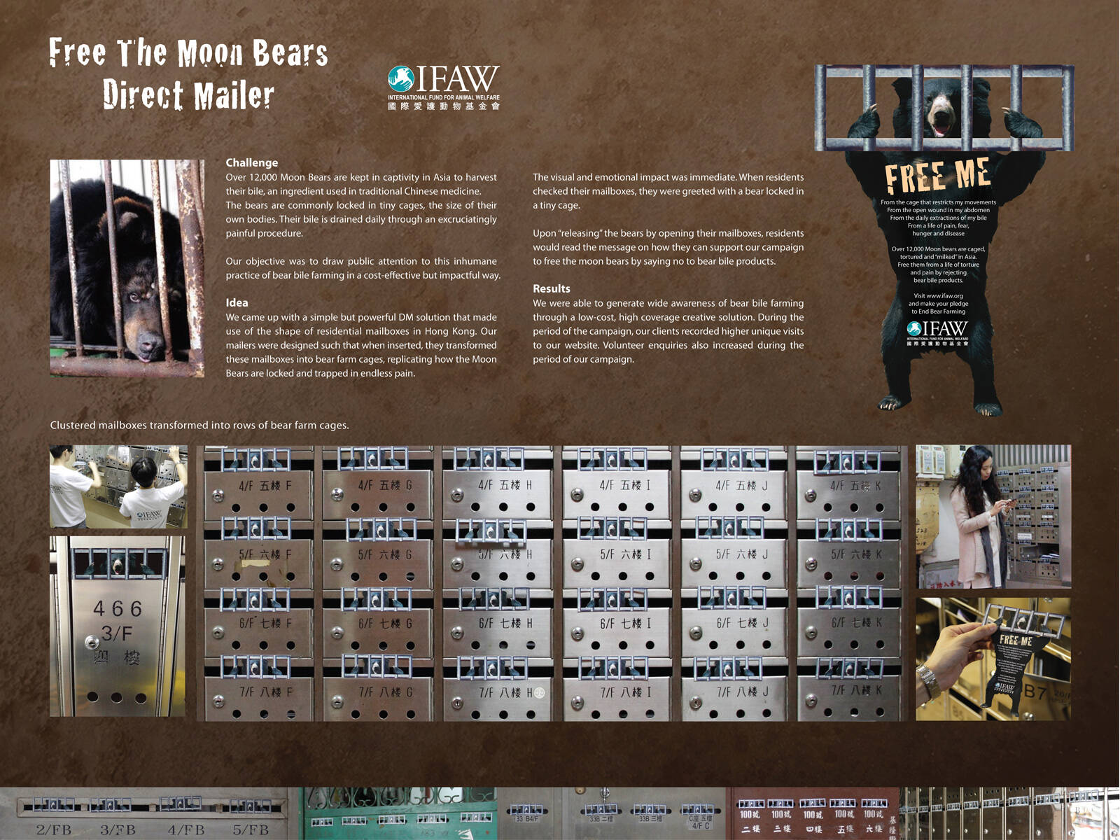 This professional campaign titled 'Free the moon bear' was published in China in March, 2012. It was created for the brand: International Fund For Animal Welfare, by ad agency: JWT. This Ambient medium campaign is related to the Public Interest industry and contains 1 media asset. It was submitted over 13 years ago.