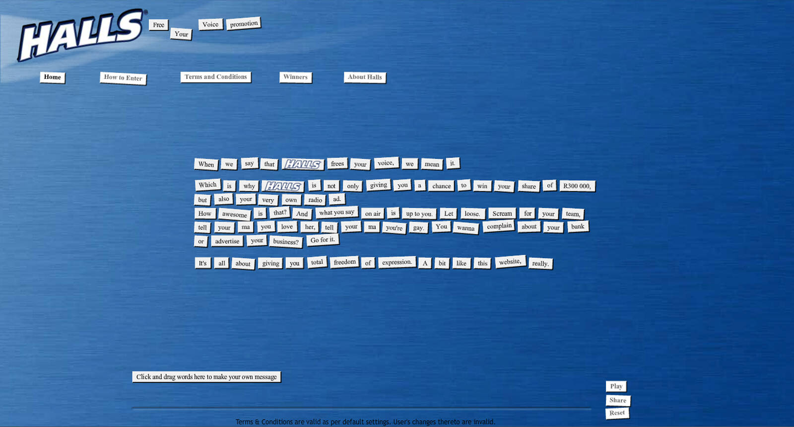Halls throat lozenges give you your voice back. So we launched the “Halls. Free Your Voice.” Promotion, where people could win their own radio ad to literally say whatever they wanted. On a very small budget, the competition needed a website that covered all the Terms & Conditions, yet still communicated the “Free Your Voice” concept. Our simple idea was to make every bit of text on the site out of digital, audio fridge poetry, so people could move all the words around to create, hear and share their own messages in millions of different ways. Now that’s freedom.