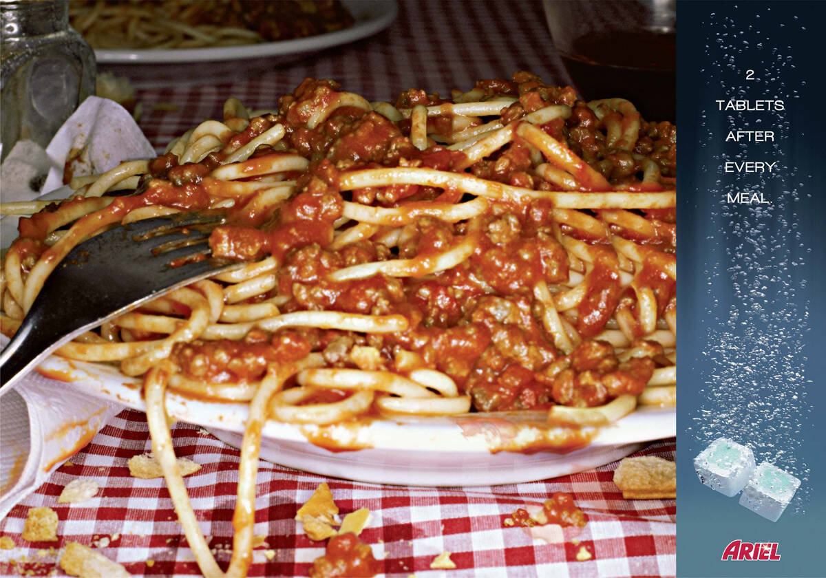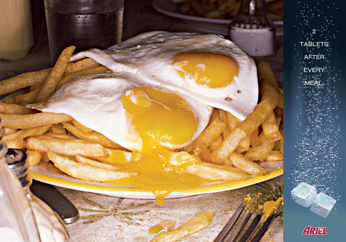 This professional campaign titled 'Fried eggs, Nachos, Pasta' was published in Argentina in March, 2007. It was created for the brand: Ariel, by ad agency: Saatchi & Saatchi. This Print medium campaign is related to the House, Garden industry and contains 3 media assets. It was submitted over 18 years ago.
