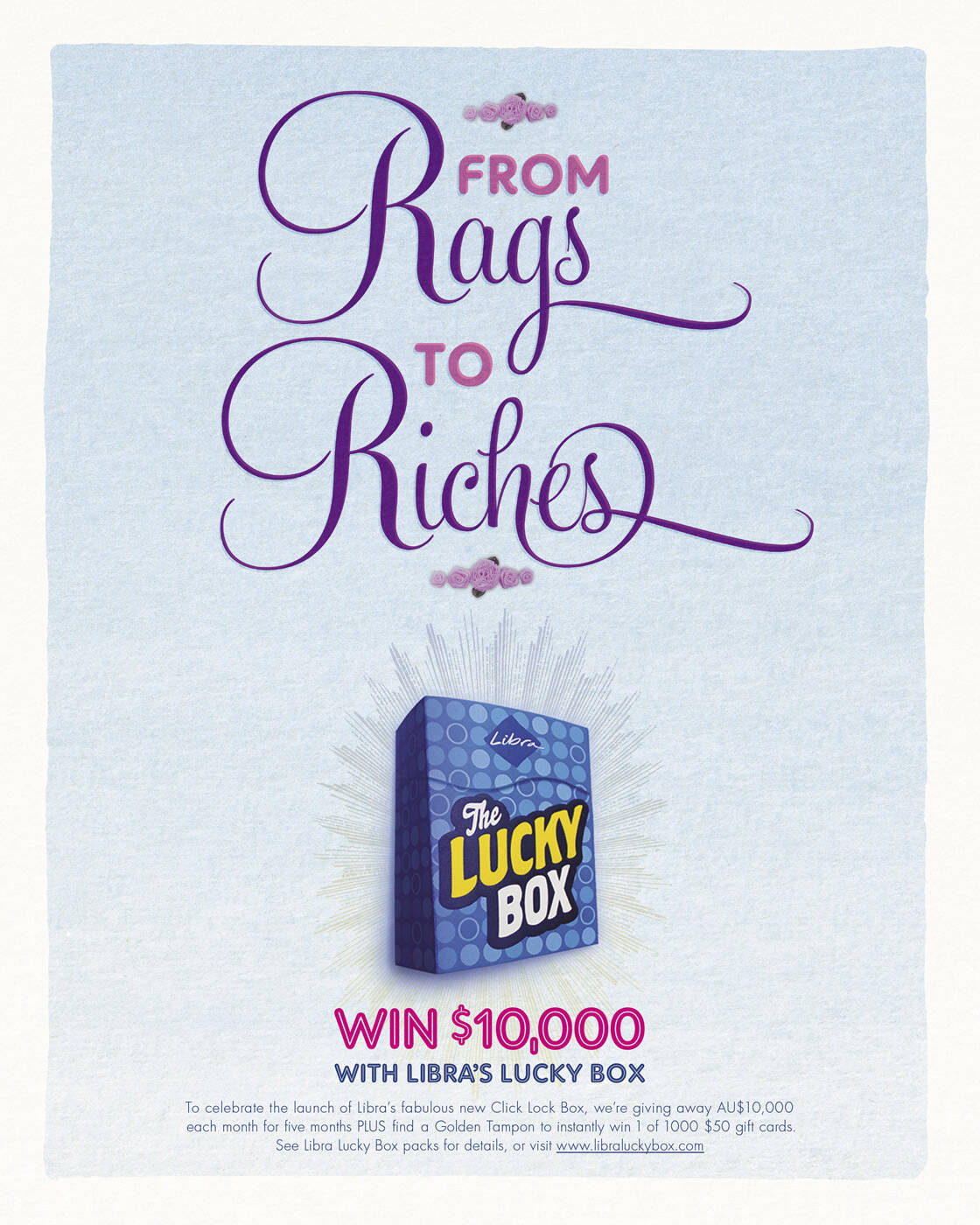 This professional campaign titled 'From Rags to Riches' was published in Australia in December, 2010. It was created for the brand: Libra, by ad agency: BBDO. This Print medium campaign is related to the Health industry and contains 1 media asset. It was submitted almost 16 years ago.