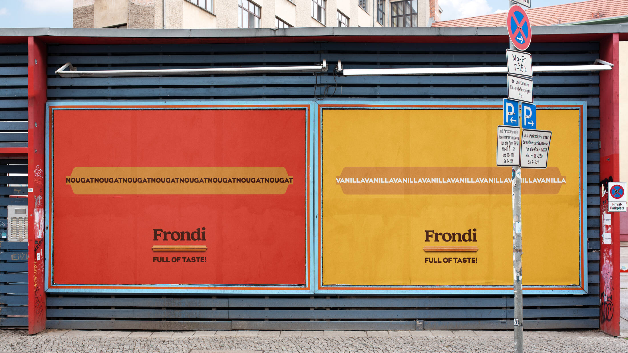 Frondi is a legendary and simple Croatian long waffle snack filled with various tasty creams. Campaign uses simple illustration and typography to communicate wide range of Frondi tastes available.
