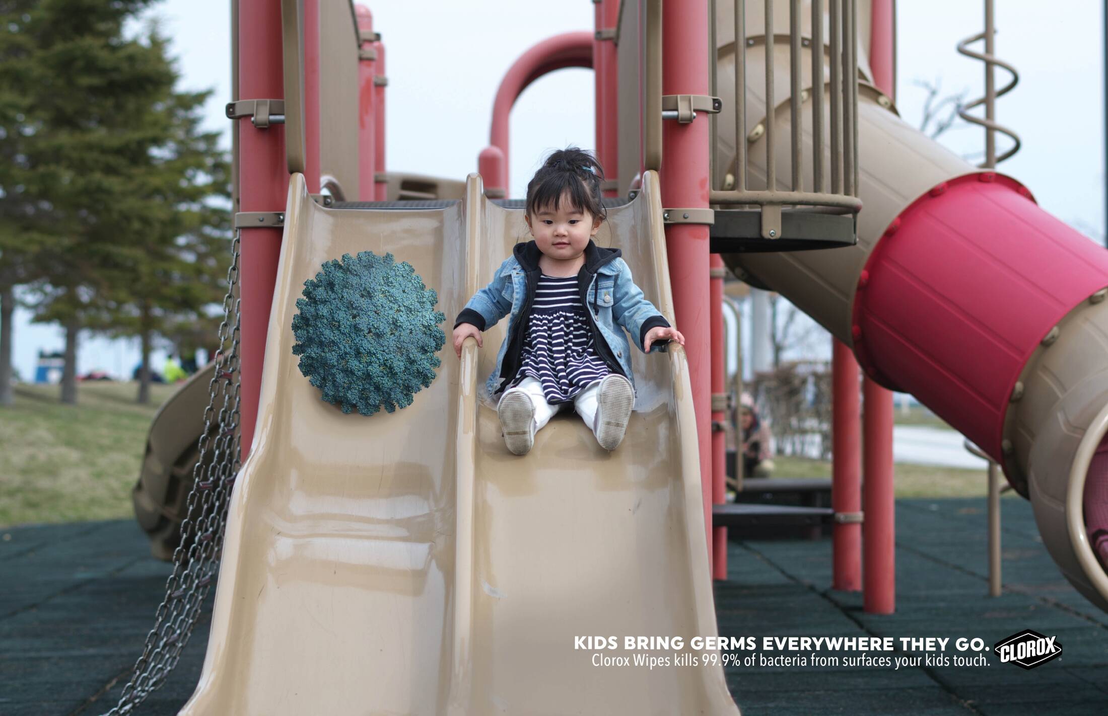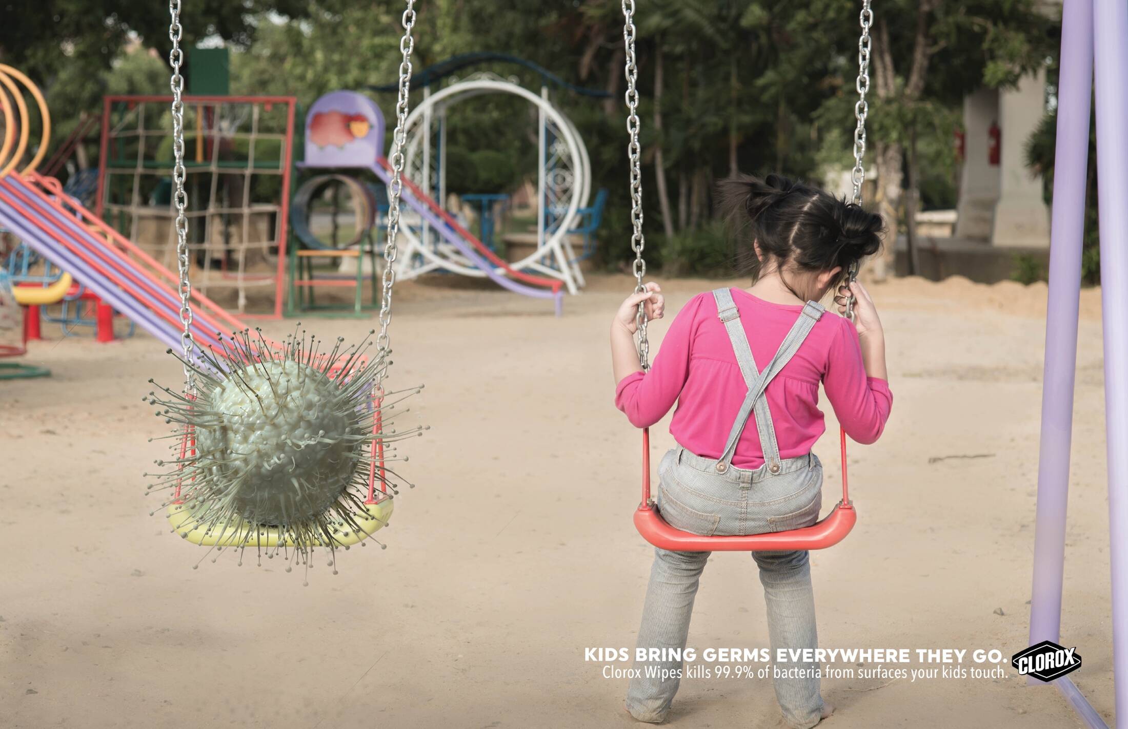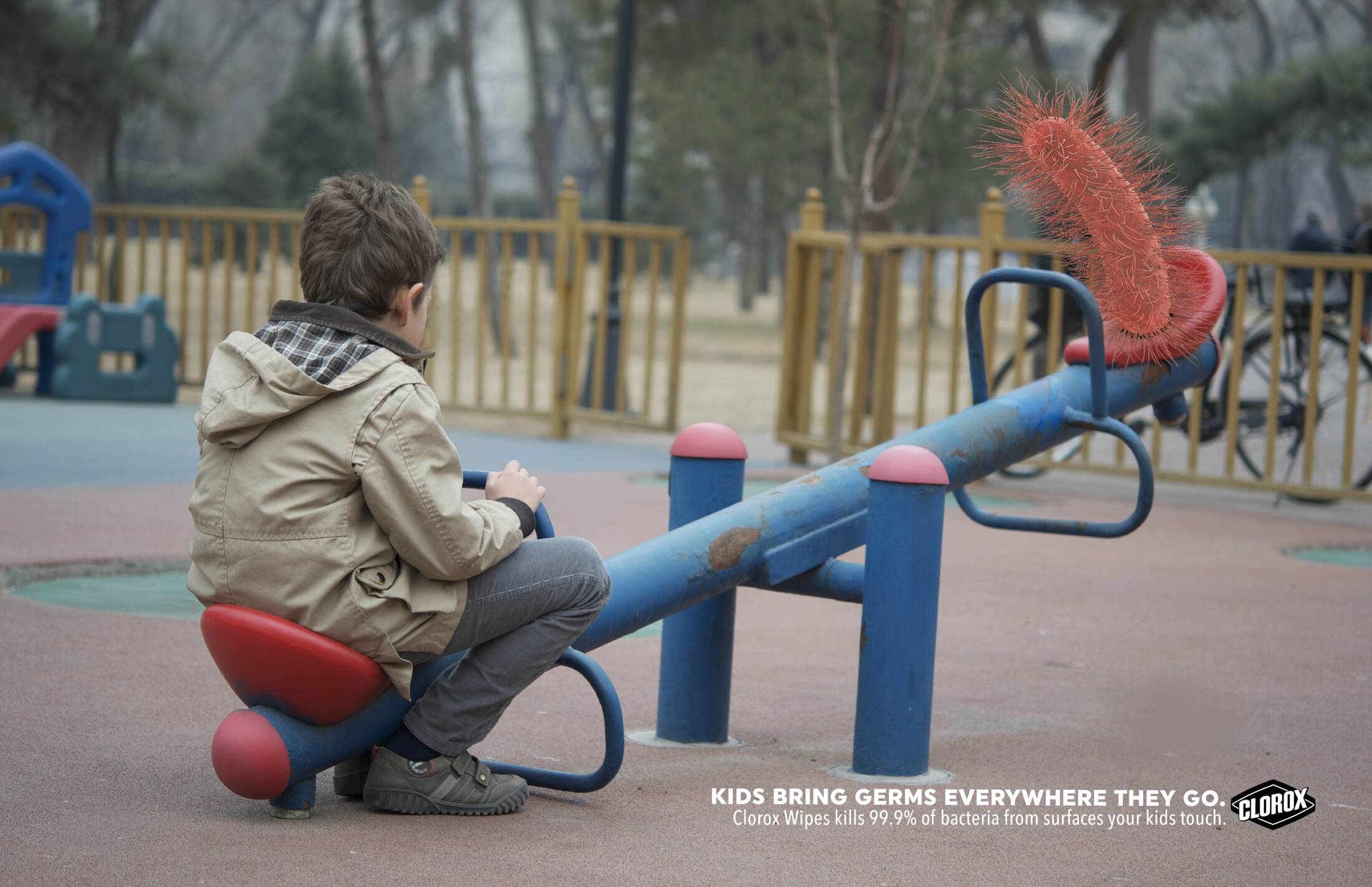 Parents all know how hard it is to keep their home germ-free, especially when children seem to pick up germs everywhere they go. The advertisement exaggerates the idea that children seem to have germs follow them wherever they go to emphasize that only Clorox Wipes has the power to keep these germs out of the home.