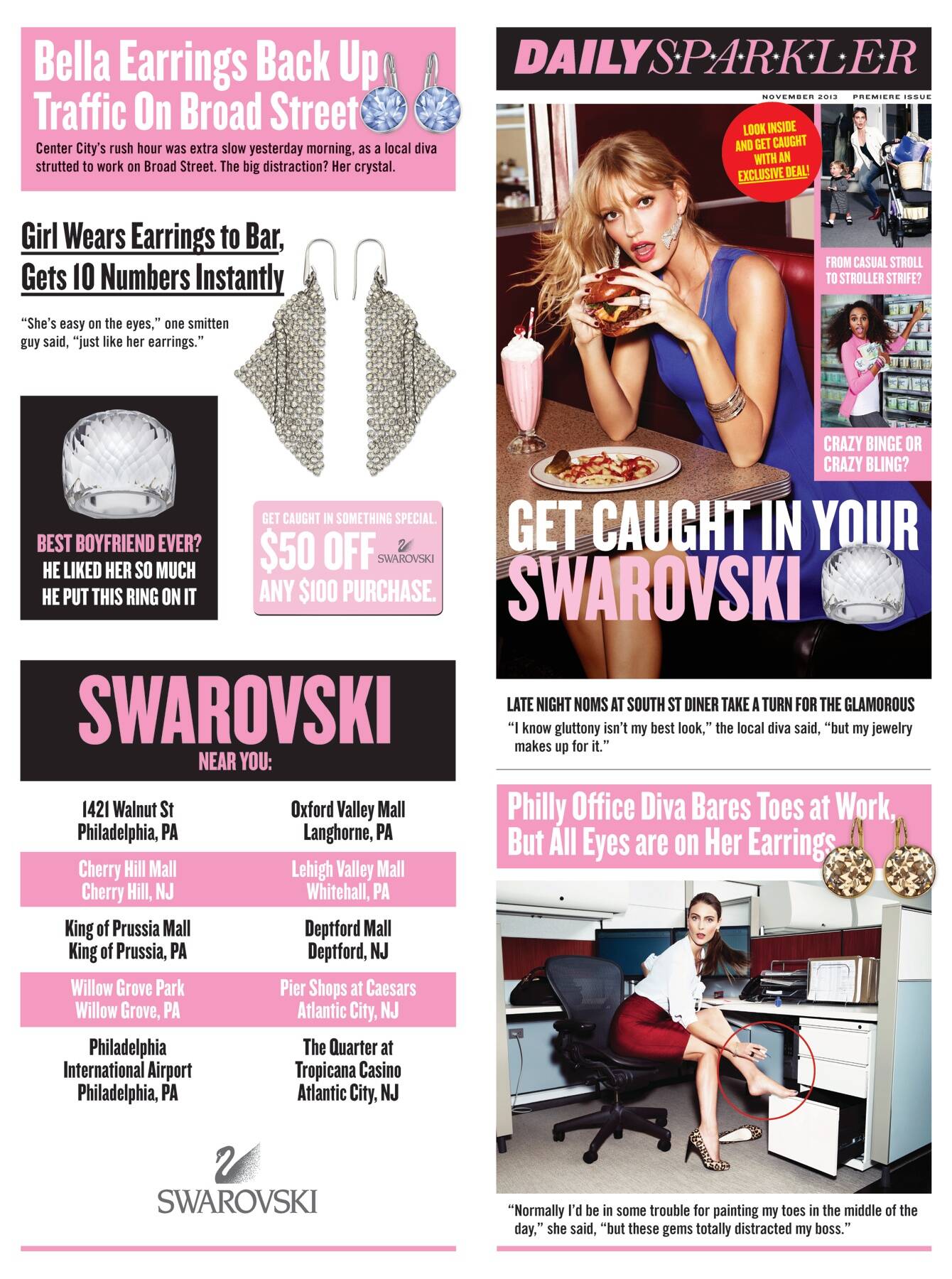 This professional campaign titled 'Get caught in your Swarovski' was published in United States in November, 2013. It was created for the brand: Swarovski, by ad agency: Red Tettemer. This Print medium campaign is related to the Personal Accessories industry and contains 7 media assets. It was submitted about 12 years ago.