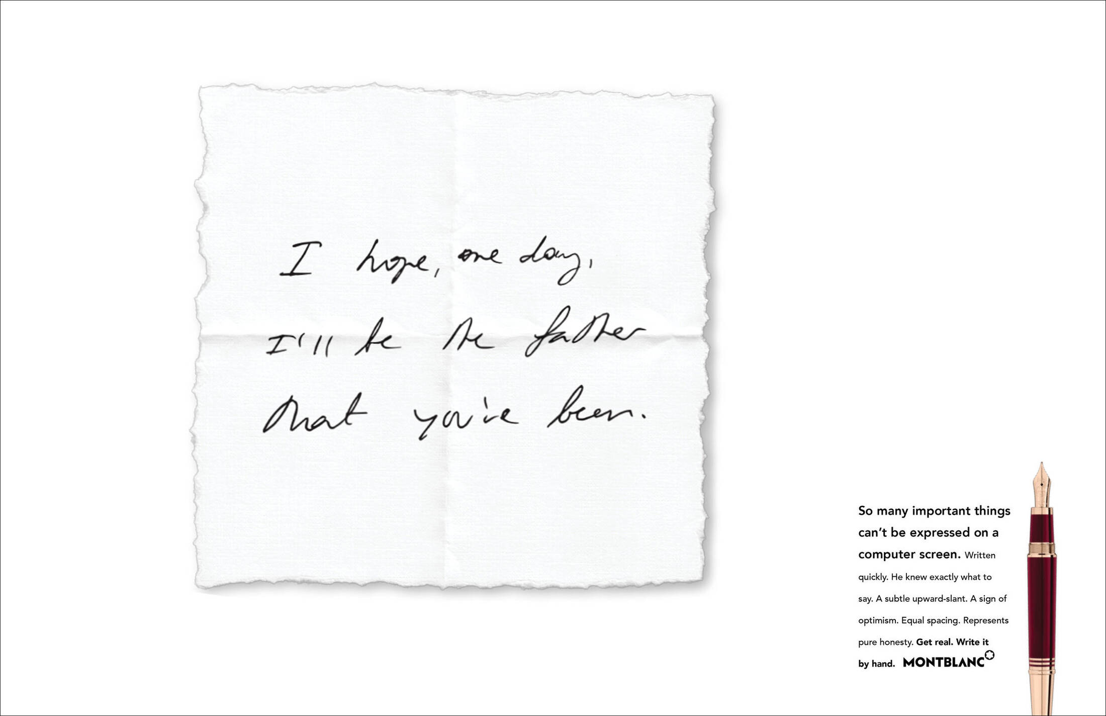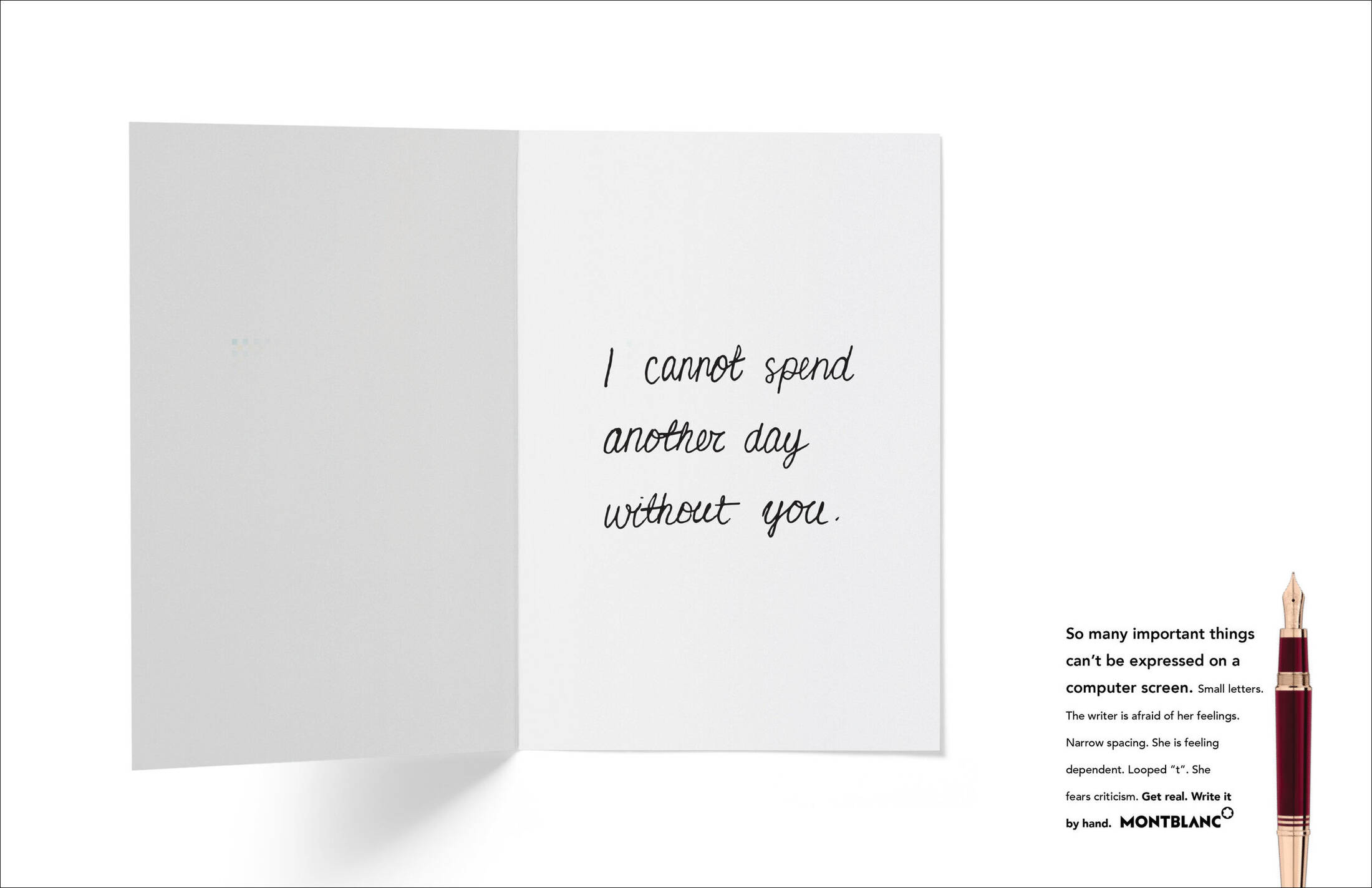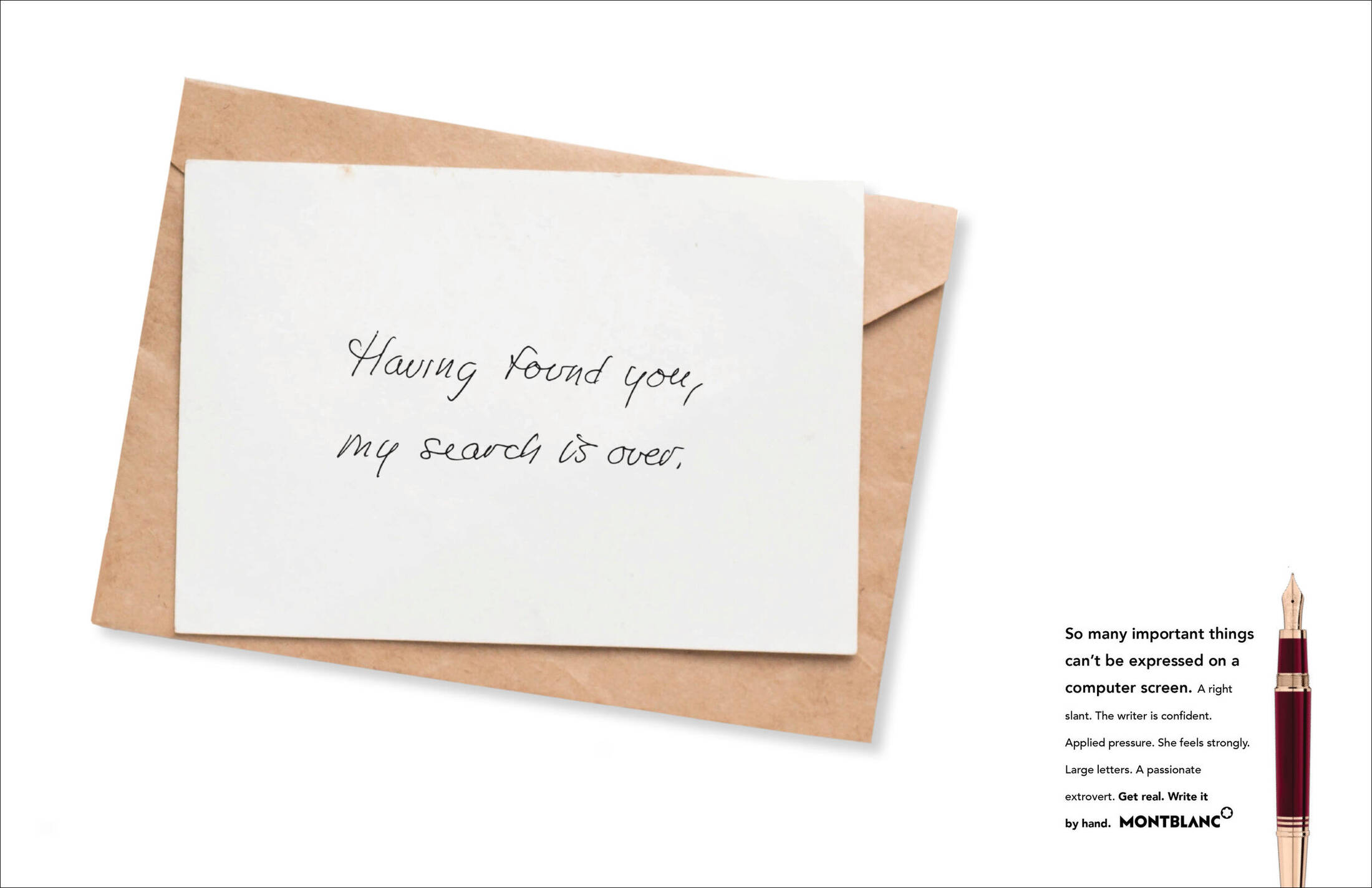 This student campaign titled 'Get real. Write it by hand.' was published in United States in May, 2020. It was created for the brand: Montblanc, by ad school: S.I. Newhouse School of Public Communications. This Print medium campaign is related to the House, Garden and Office Equipment industries and contains 3 media assets. It was submitted almost 5 years ago by Student: Selin of S.I Newhouse School of Public Communications.