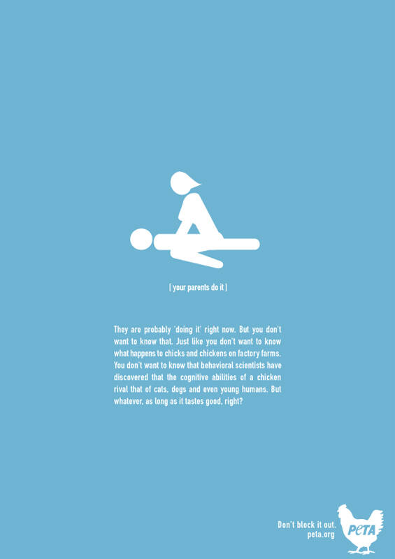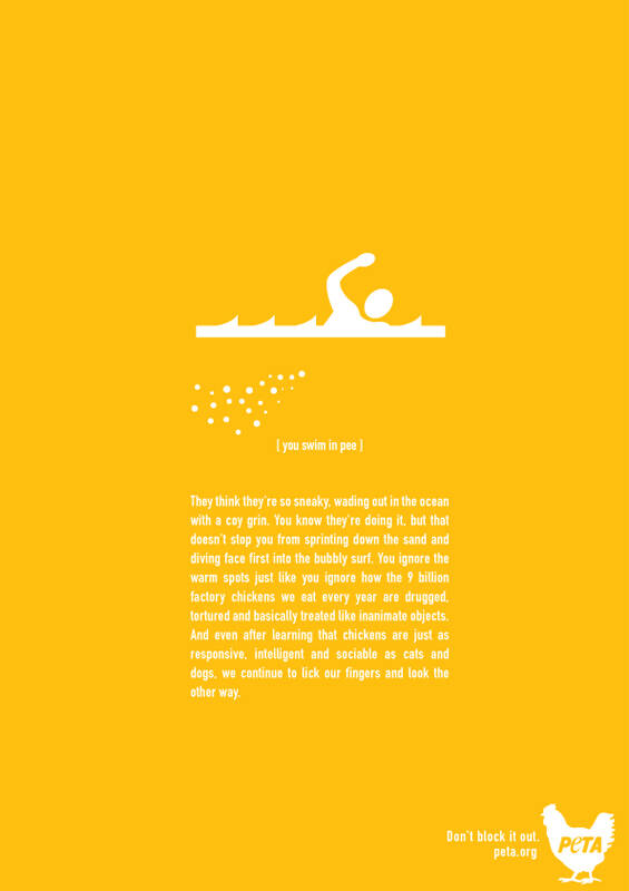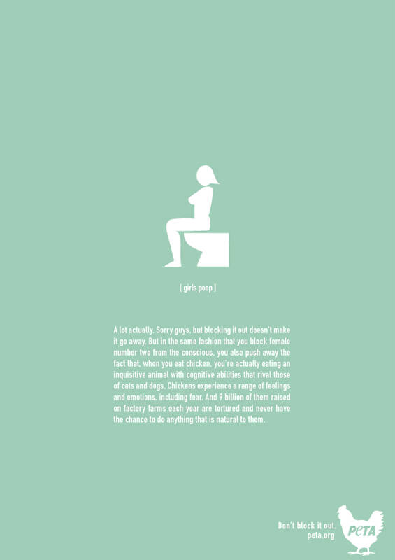 This NSFW professional campaign titled 'Girls poop, You swim in pee, Your parents do it' was published on December 01, 2006. It was created for the brand: PETA, by ad agency: Jack Bagdadi. This Print medium campaign is related to the Public Interest industry and contains 3 media assets. It was submitted almost 19 years ago.