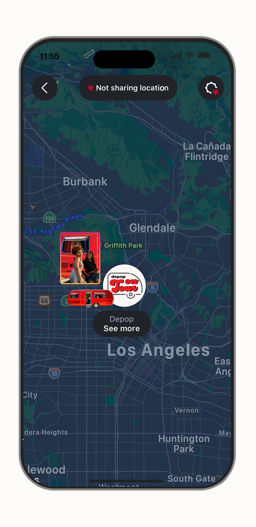 A snapshot of a branded pin on Instagram's map, allowing viewers to track the Depop-Mobile's location in real time. The map also includes user-generated stories that have been geo-tagged with the location of the pop-up.