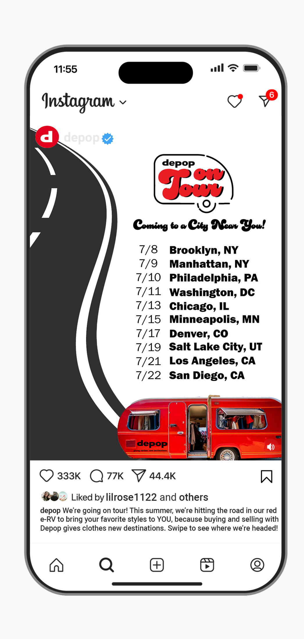 Instagram post announcing the upcoming Depop-Mobile tour; graphics include the cities that the Depop-Mobile will be stopping in and the corresponding dates.
