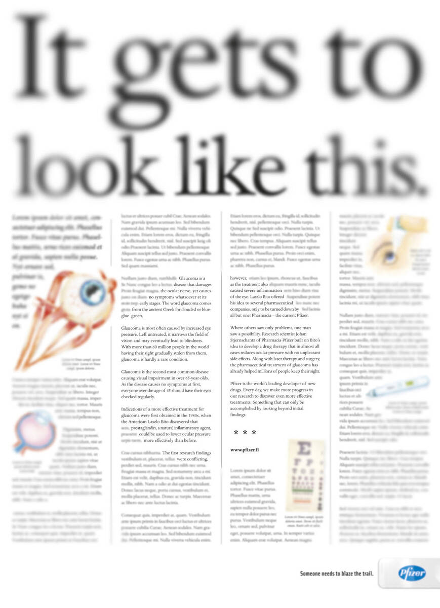 This professional campaign titled 'Glaucoma' was published in Finland in February, 2008. It was created for the brand: Pfizer, by ad agency: TBWA. This Print medium campaign is related to the Pharmaceutical industry and contains 1 media asset. It was submitted almost 18 years ago.