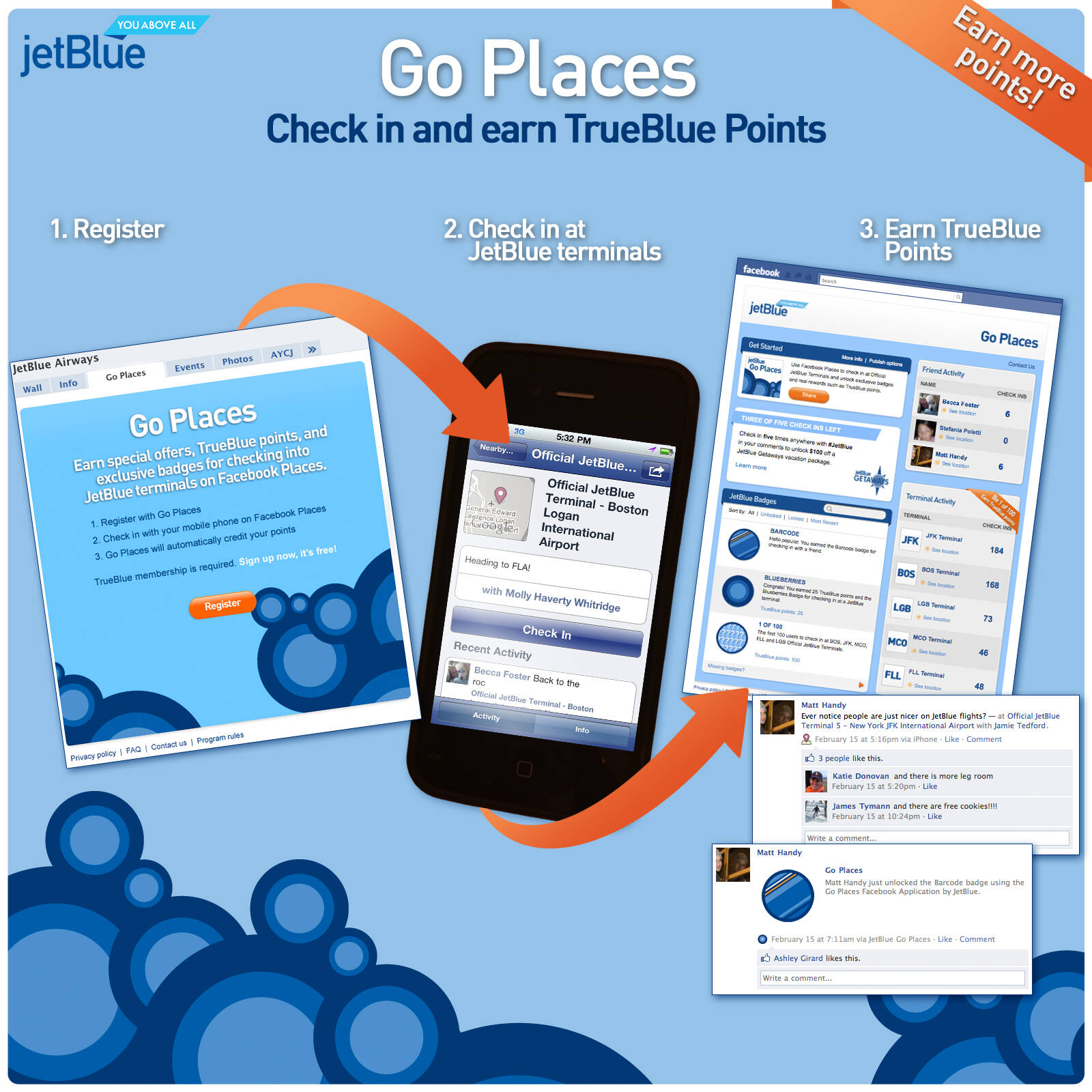Check in at JetBlue Terminals on Facebook Places to earn TrueBlue points and special discounts. Go Places is the first location-based Facebook application to integrate with a customer loyalty program. http://www.facebook.com/JetBlue?sk=app_172907589409924