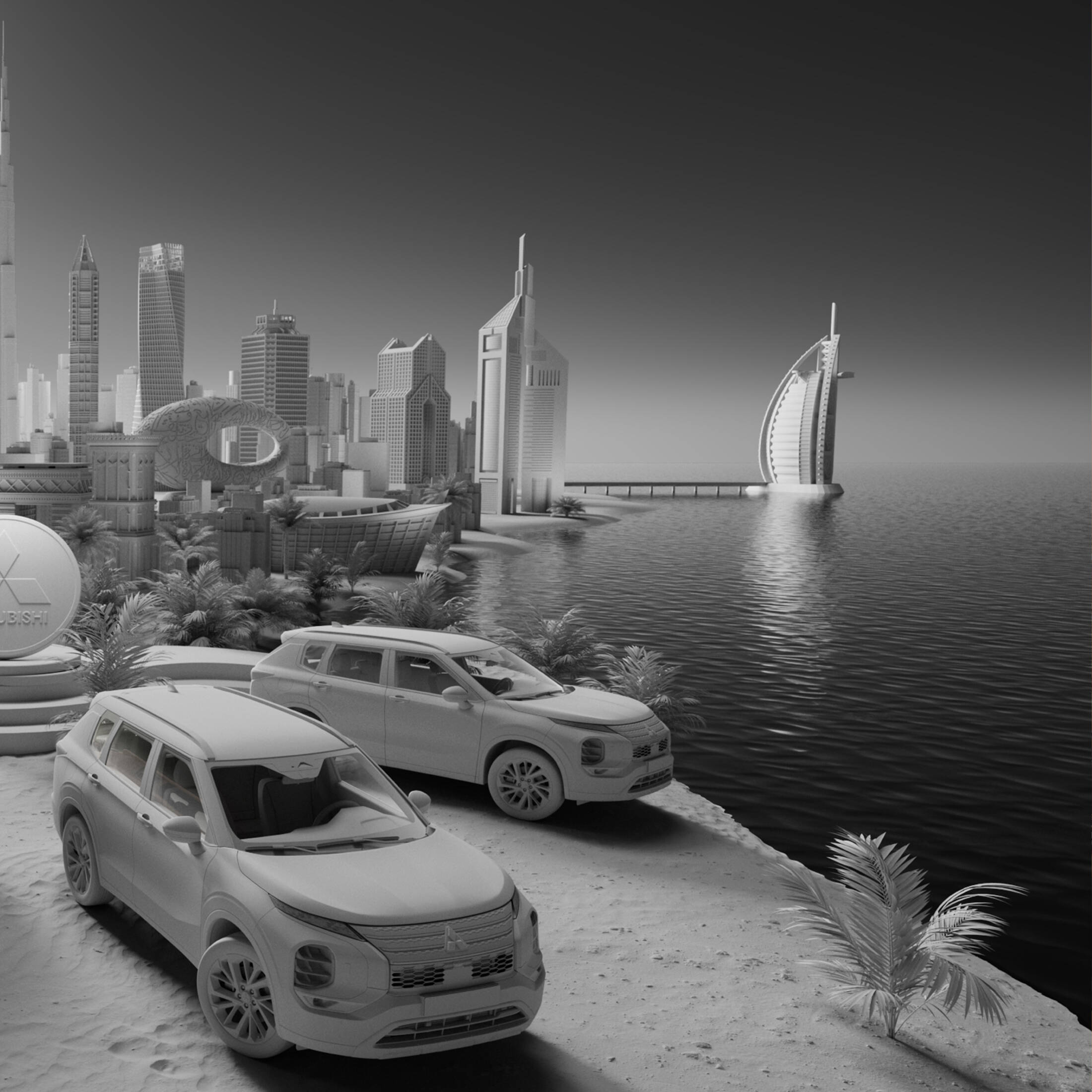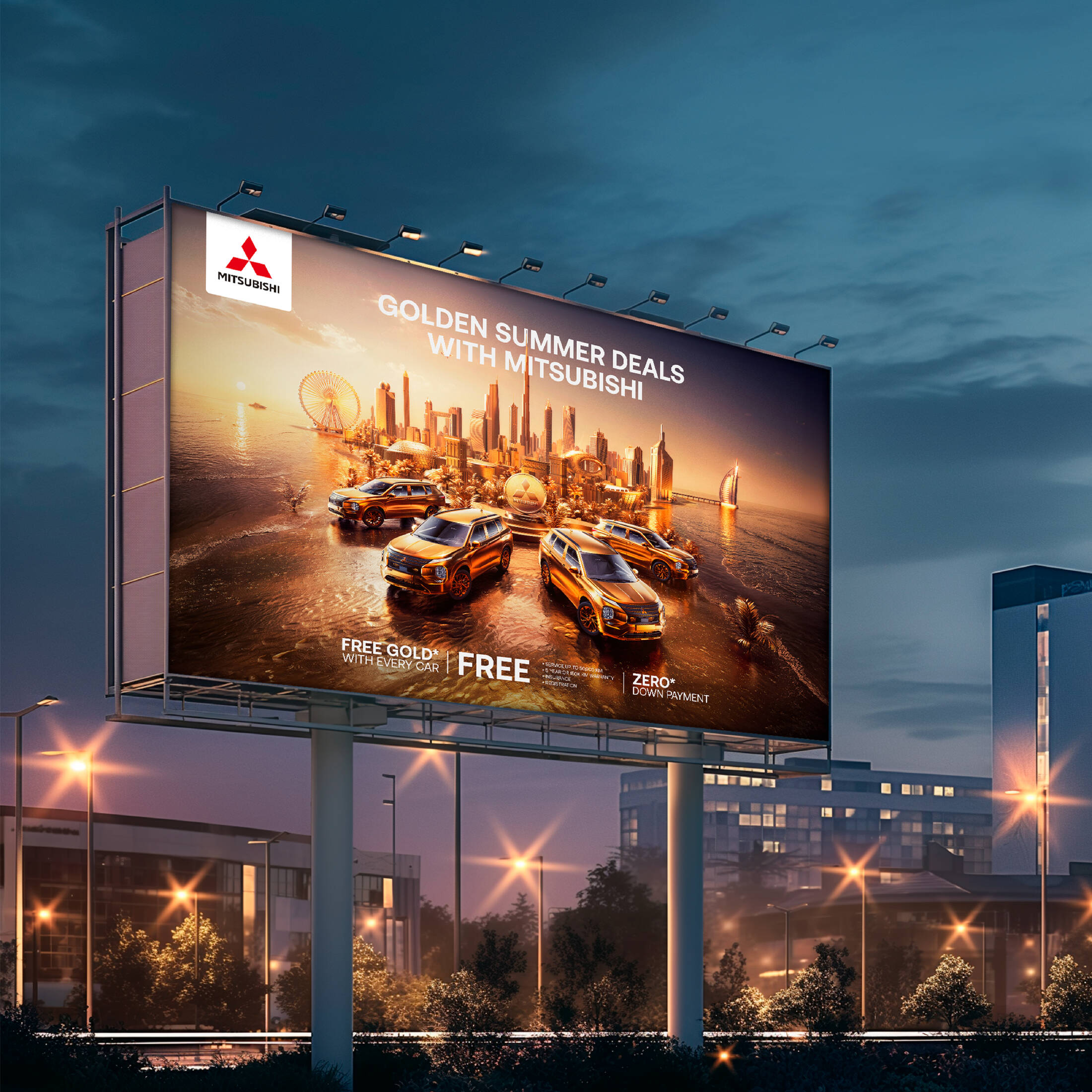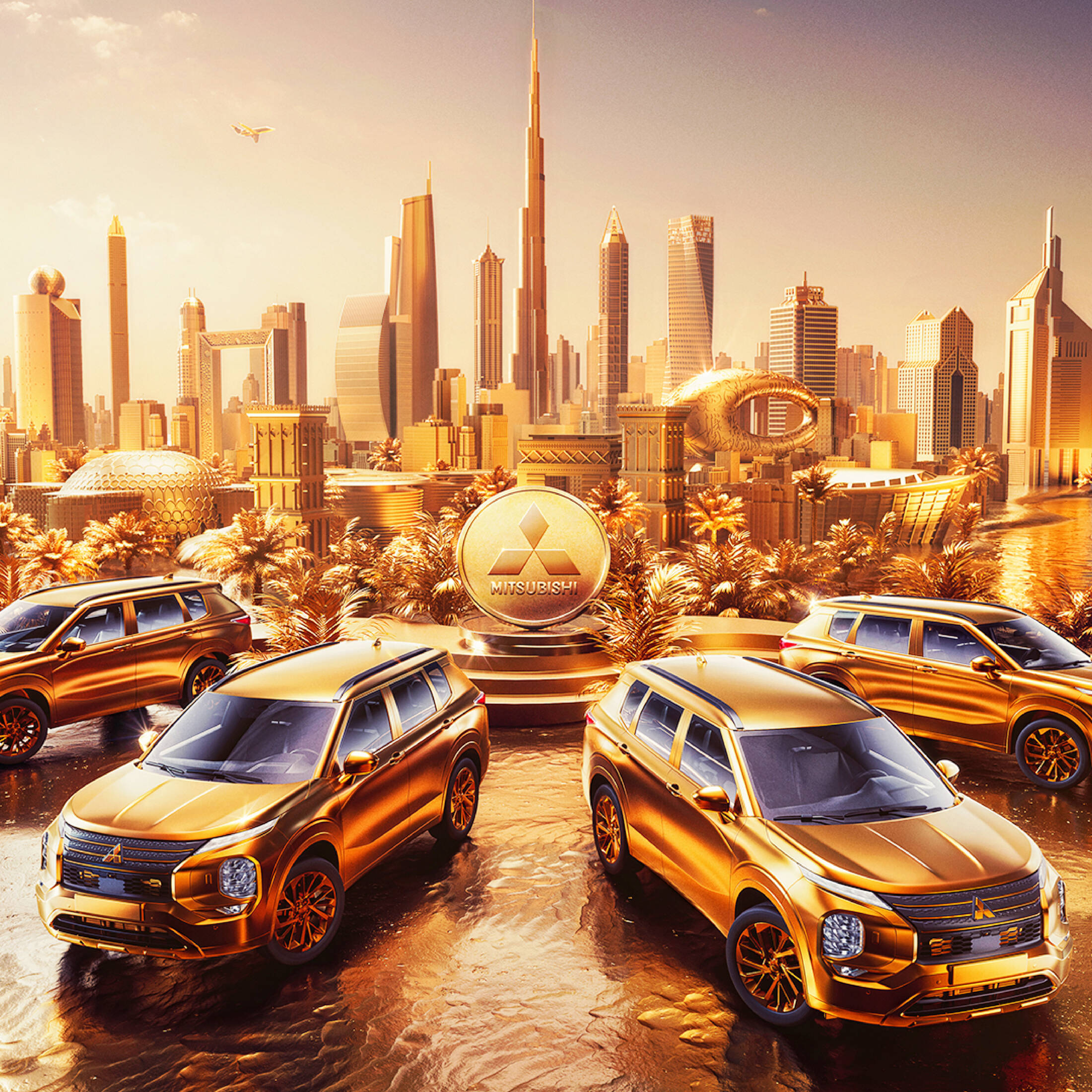 This 3D manipulated visual radiates luxury and sophistication with its predominantly golden hue, perfectly aligning with the offer of free gold with every "Mitsubishi" vehicle. The golden backdrop not only symbolizes the value and prestige associated with gold but also reflects the opulence of Dubai's skyline. Showcasing Mitsubishi vehicles amidst the iconic landmarks of Dubai highlights the brand's commitment to elegance and top-tier performance, appealing to discerning customers who appreciate both luxury and quality.