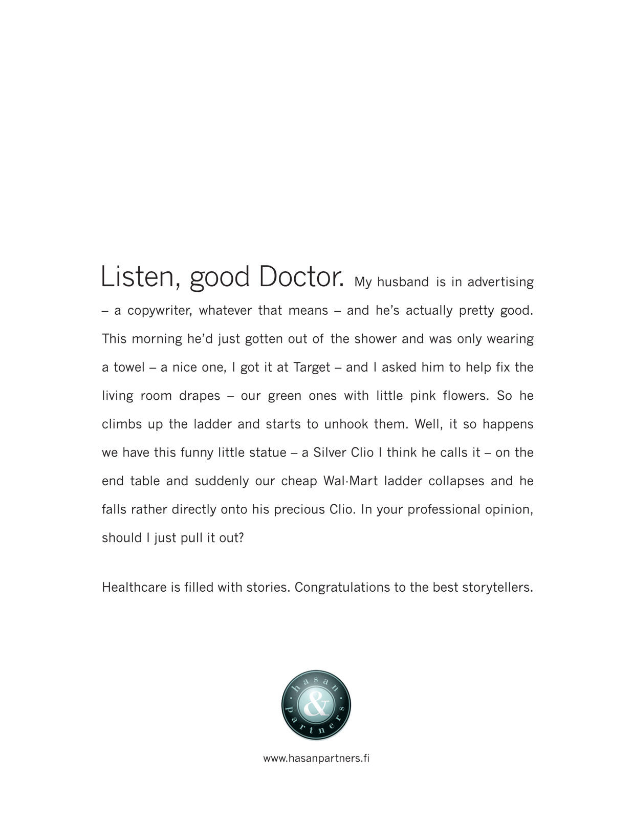 This ad appeared in the Healthcare Clio Winners Book. hasan&partners was a finalist (and they eventually won a bronze Clio) and they wanted to congratulate other winners.