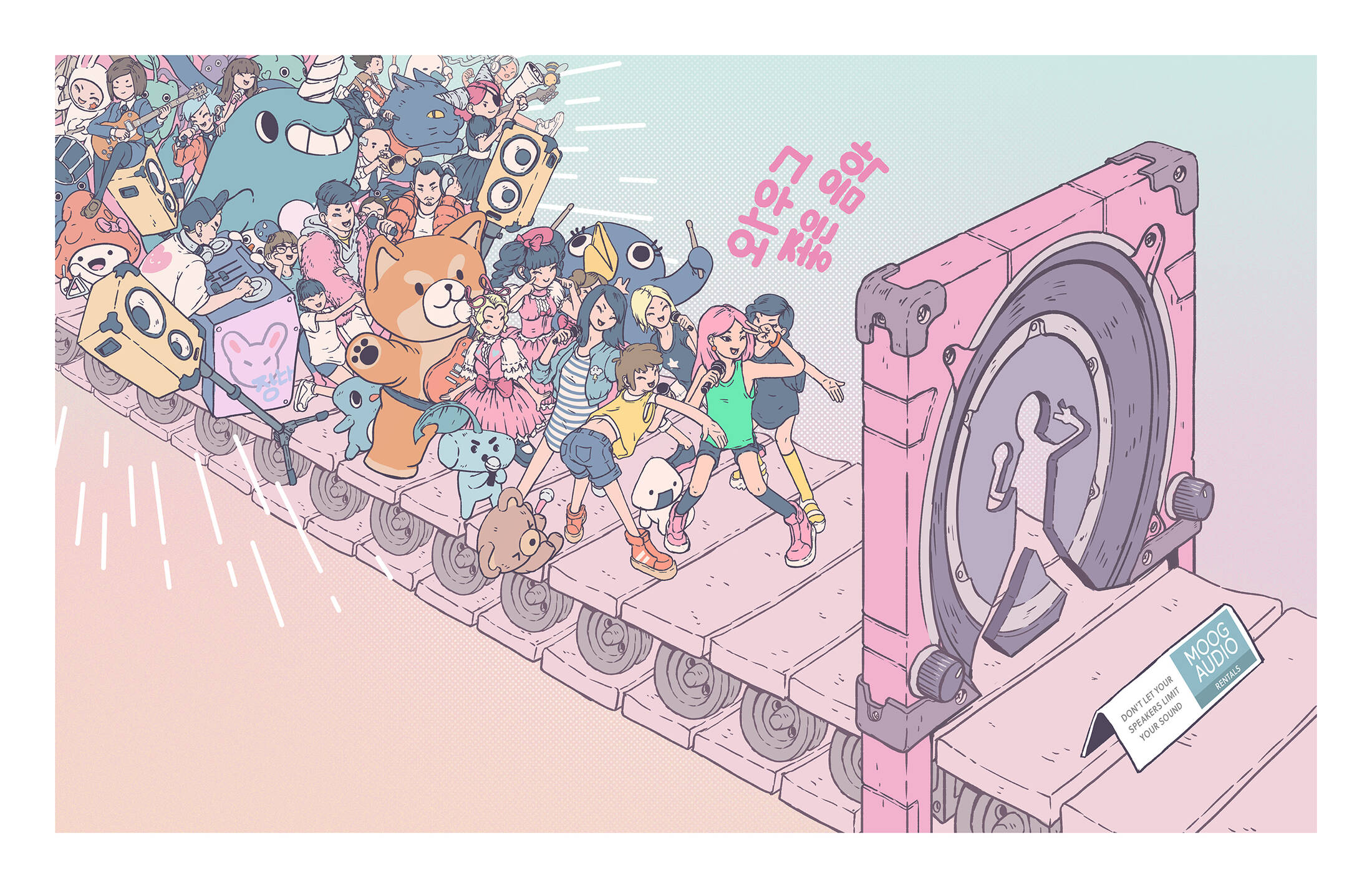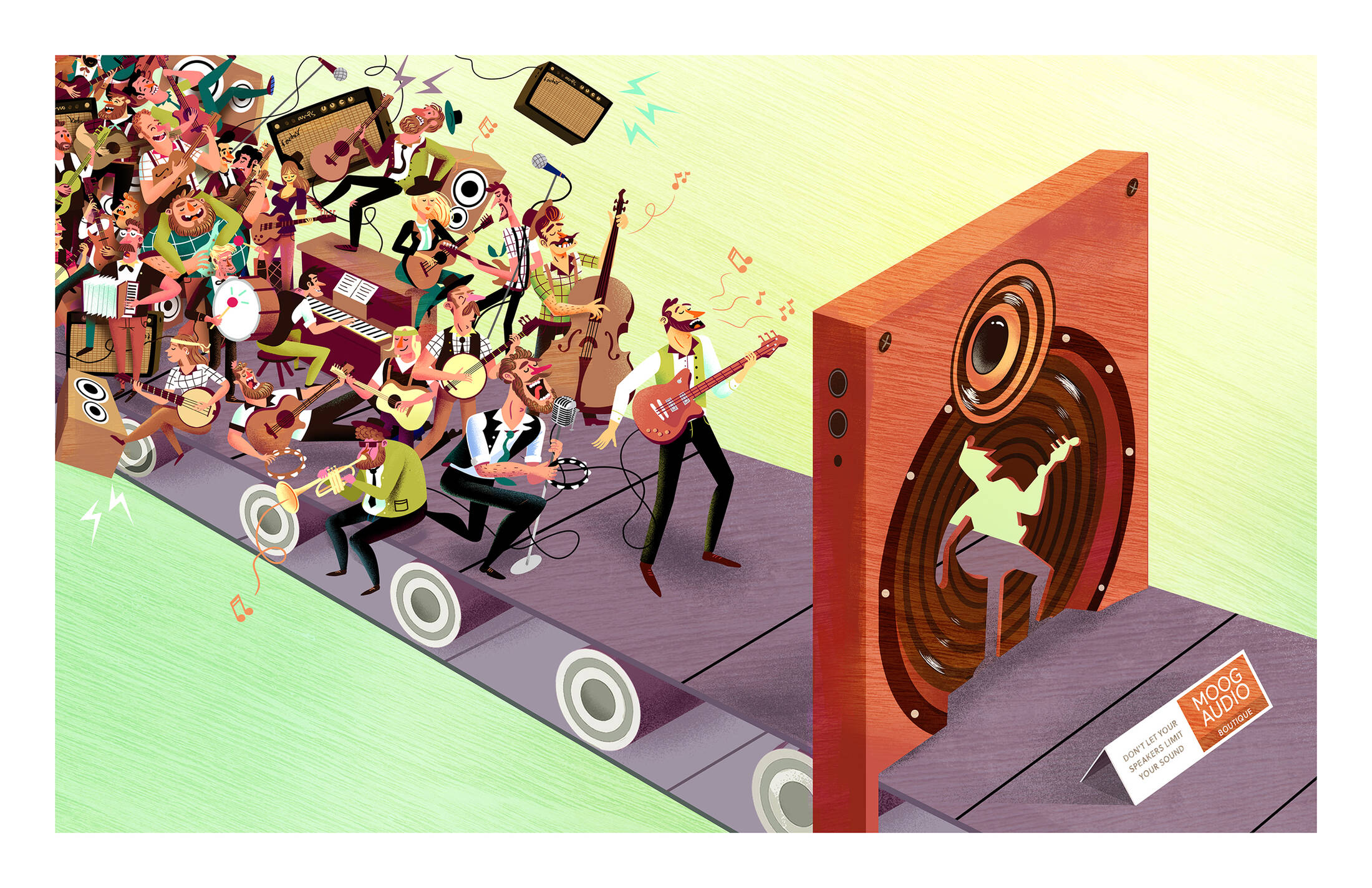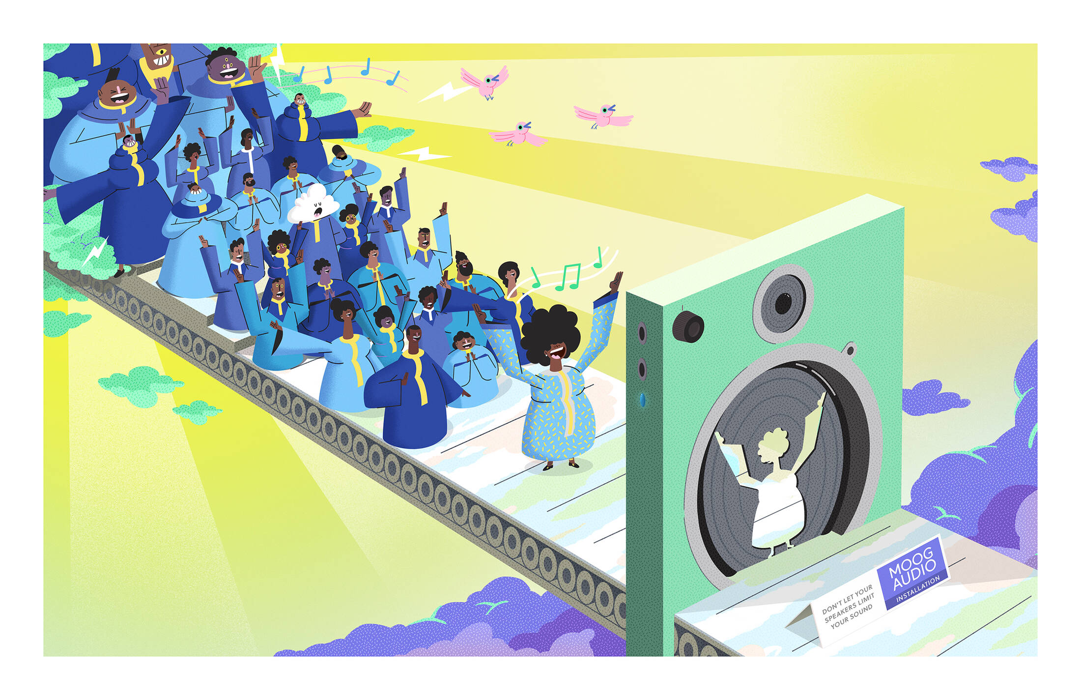 Moog Audio is a popular audio hi-fi shop known for high-end speakers and sound equipment, based out of Montreal and Toronto. To illustrate the difference in sound quality that high-end speaker deliver compared to average speakers, we created a illustrated campaign that highlights the main drawback of mediocre speakers: they filter out much of the richness of the sound, and you end up only hearing a fraction of the actual song.