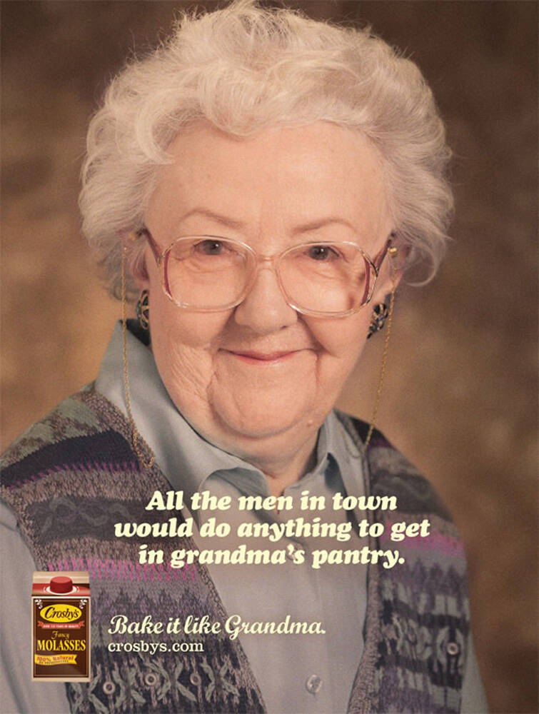 This professional campaign titled 'Grandma's Brownie, Grandma's Muffin, Grandma's Pantry, Grandma's Country Pie, Grandma's...' was published in United States in December, 2011. It was created for the brand: Crosby's, . This Print medium campaign is related to the Food industry and contains 6 media assets. It was submitted almost 14 years ago.