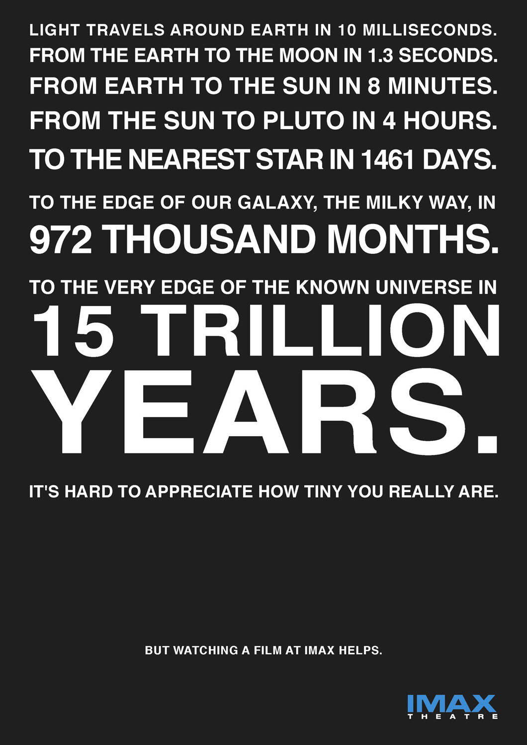 This professional campaign titled 'Gravity, Tiny, Curve' was published in Australia in September, 2010. It was created for the brand: IMAX, by ad agency: Swinburne. This Print medium campaign is related to the Recreation, Leisure industry and contains 3 media assets. It was submitted about 15 years ago.