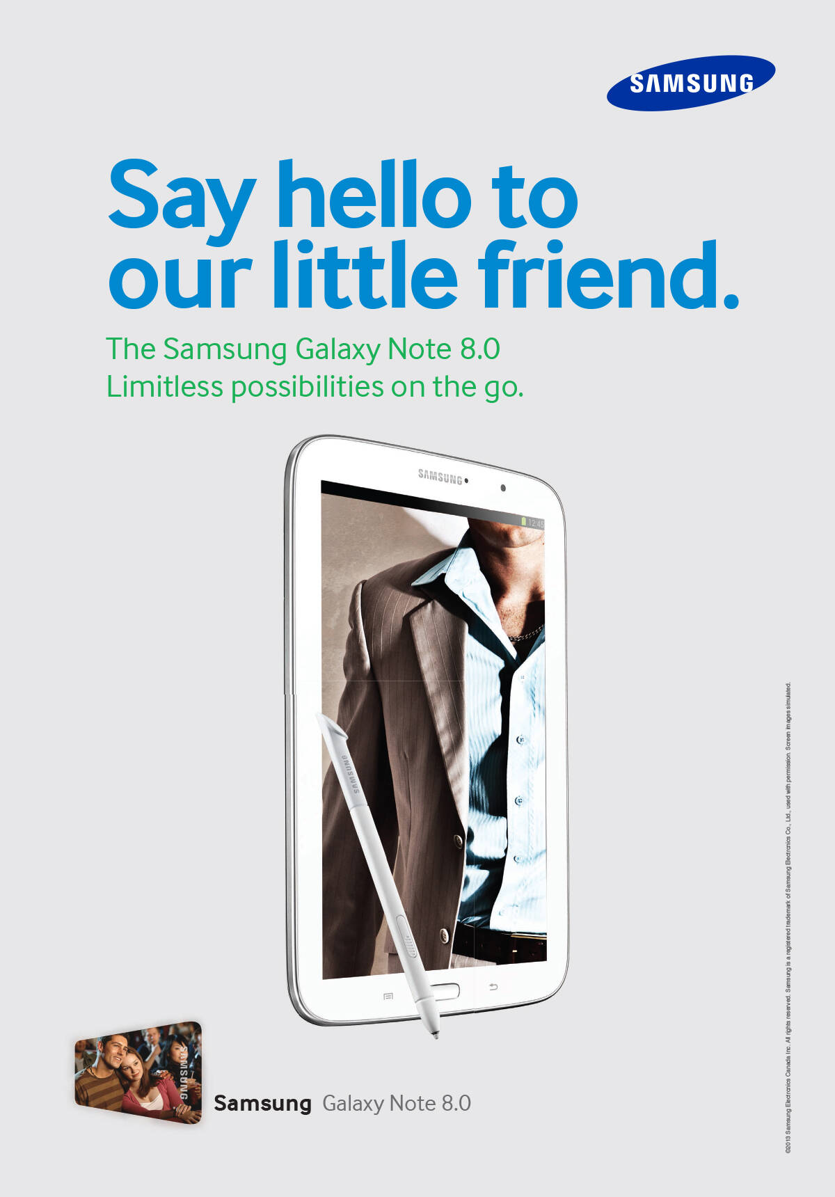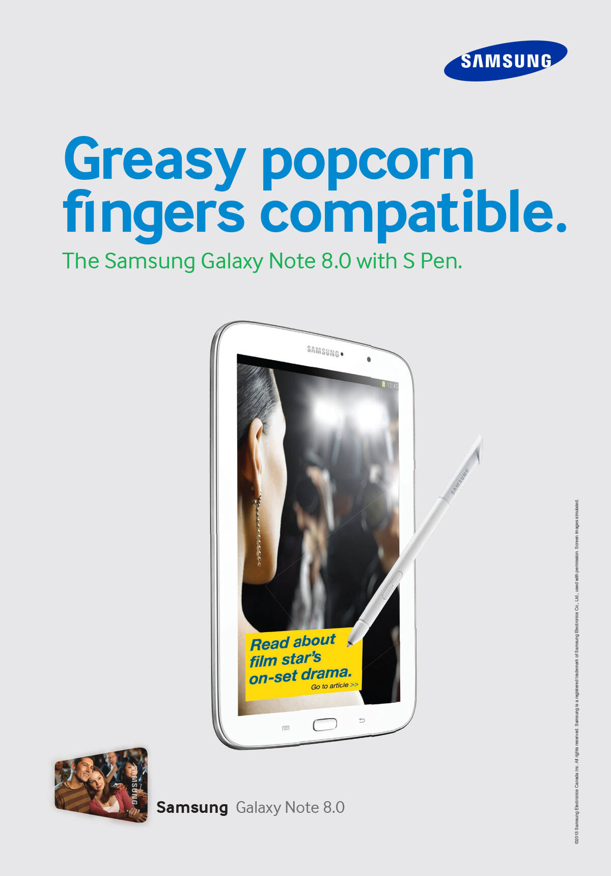 We did a movie theatre take-over in multiple locations across Canada to promote the launch of the Galaxy Note 8.0. These are three from the campaign of 9 that showcase the device features in a way movie goers can relate too.