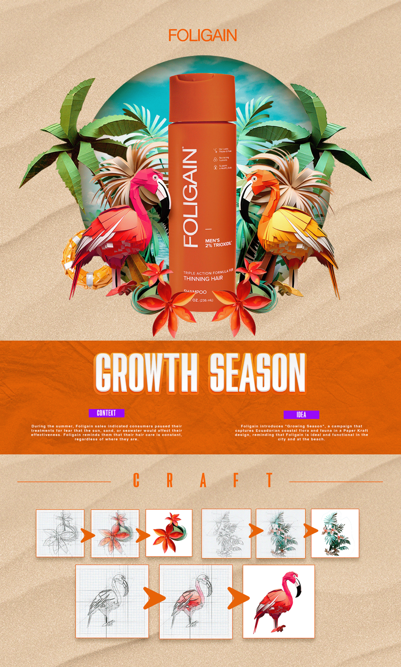 This professional campaign titled 'Growth Season' was published on February 26, 2024. It was created for the brand: Foligain, by ad agency: Geeks Ecuador. This Content, Design, and Digital media campaign is related to the Beauty, Health, and Pharmaceutical industries and contains 5 media assets. It was submitted almost 2 years ago by Geeks Ecuador: GeeksEC of Geeks.