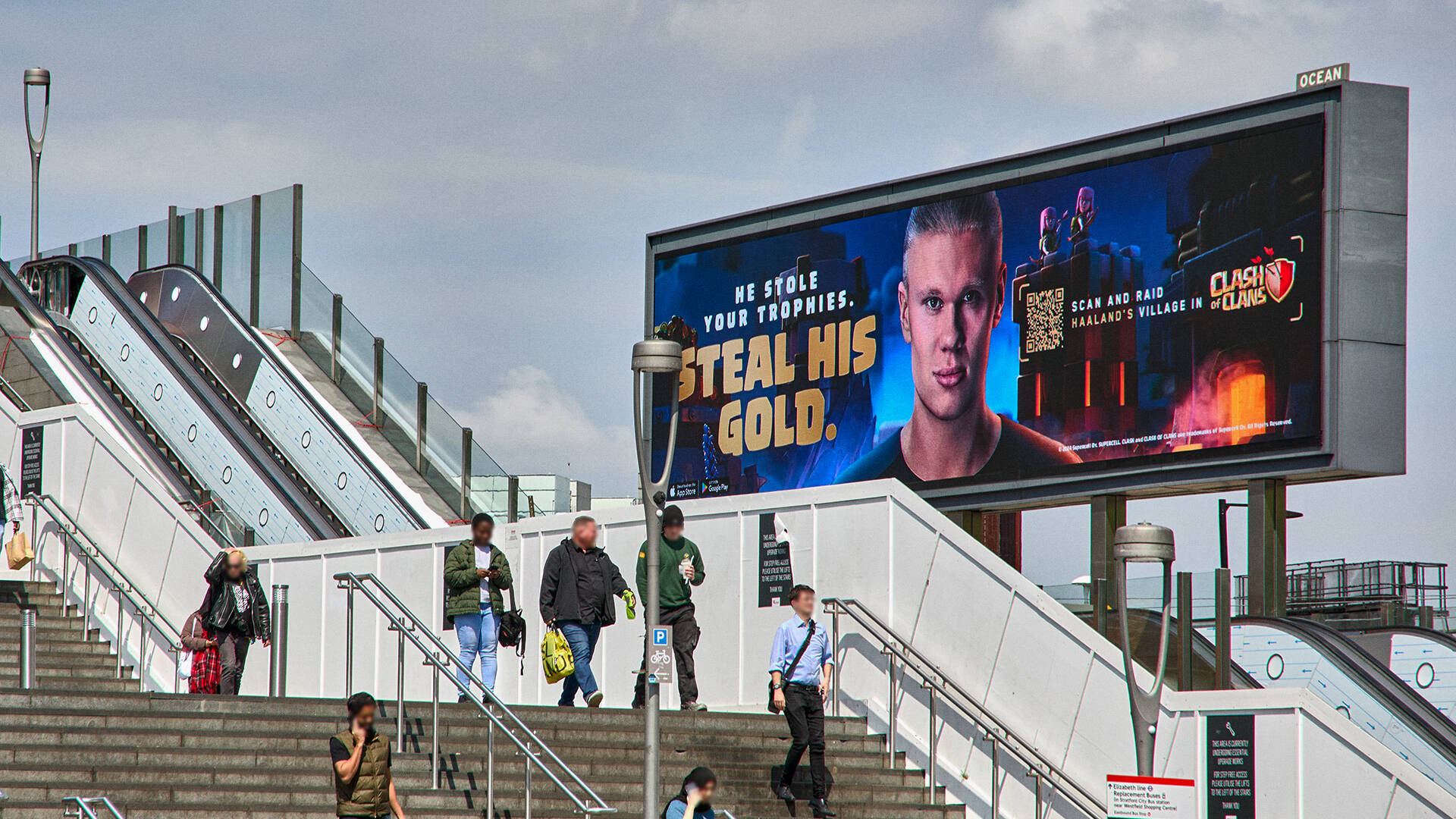 Digital billboards featuring football superstar Erling Haaland have appeared across six European cities (London, Liverpool, Manchester, Madrid, Milan, Munich). The billboards are part of a new campaign by Supercell game Clash of Clans.