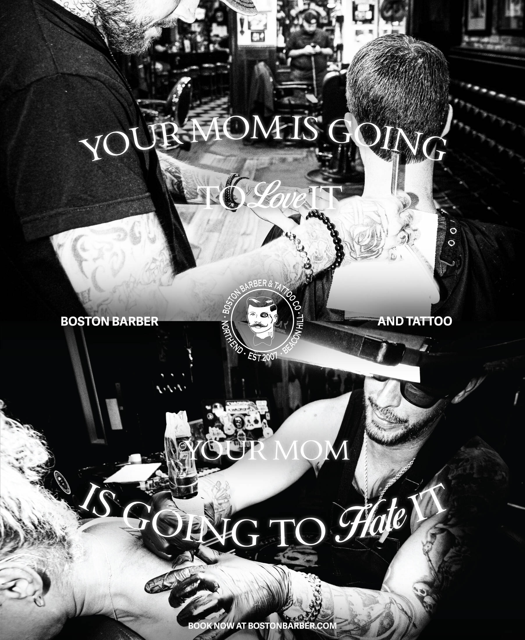 This professional campaign titled 'Hair & Ink ' was published in United States in September, 2025. It was created for the brand: Boston Barber & Tattoo Co., by ad agency: Ocean Effect. This Design, OOH Outdoor, and Print media campaign is related to the Other industry and contains 3 media assets. It was submitted 2 months ago by Ocean Effect.