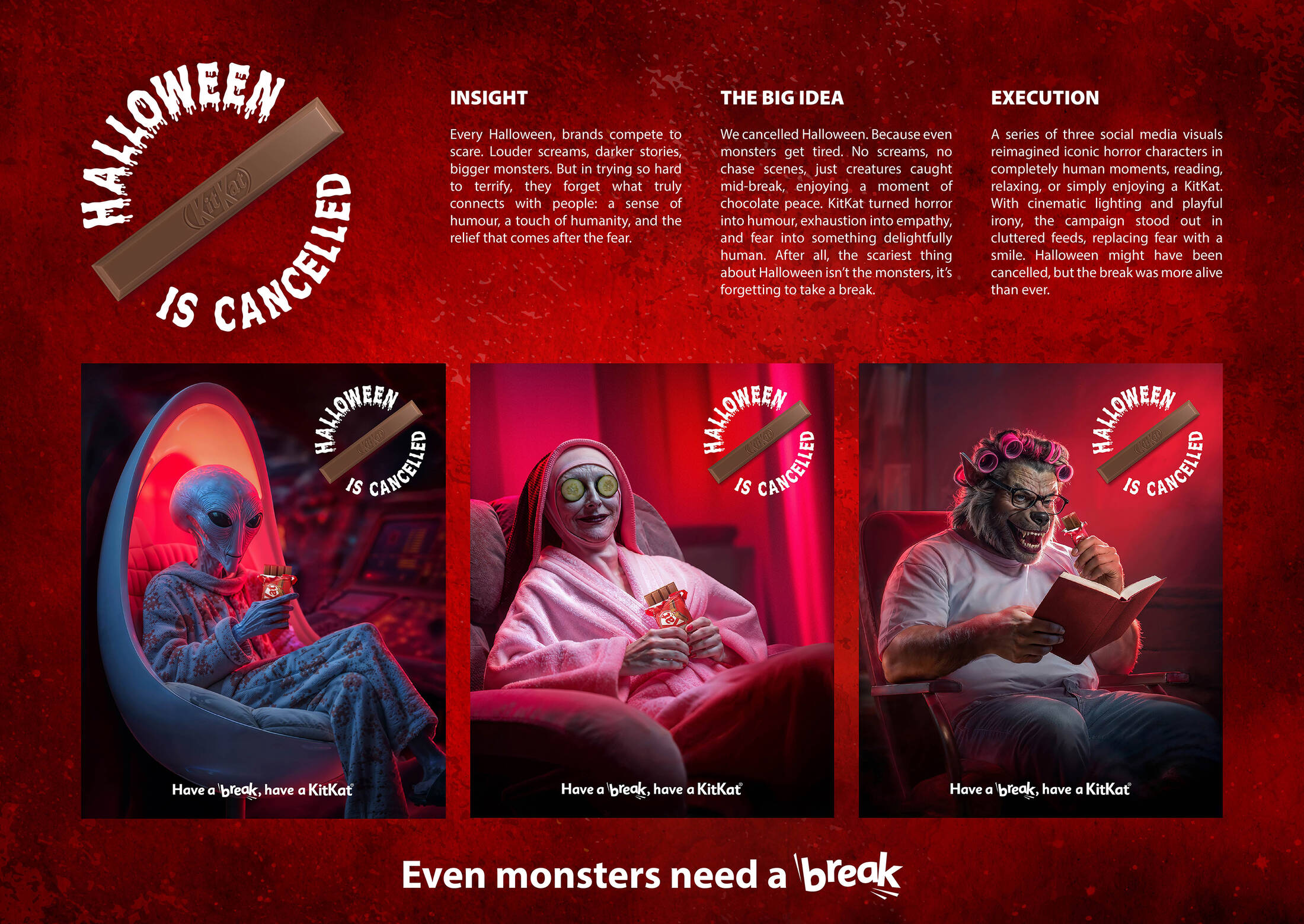 In a bold act of brand empathy, KitKat turned exhaustion into insight. Instead of chasing screams, we gave the monsters a moment of peace. No blood. No gore. Just iconic creatures caught doing something unexpectedly human: taking a break.