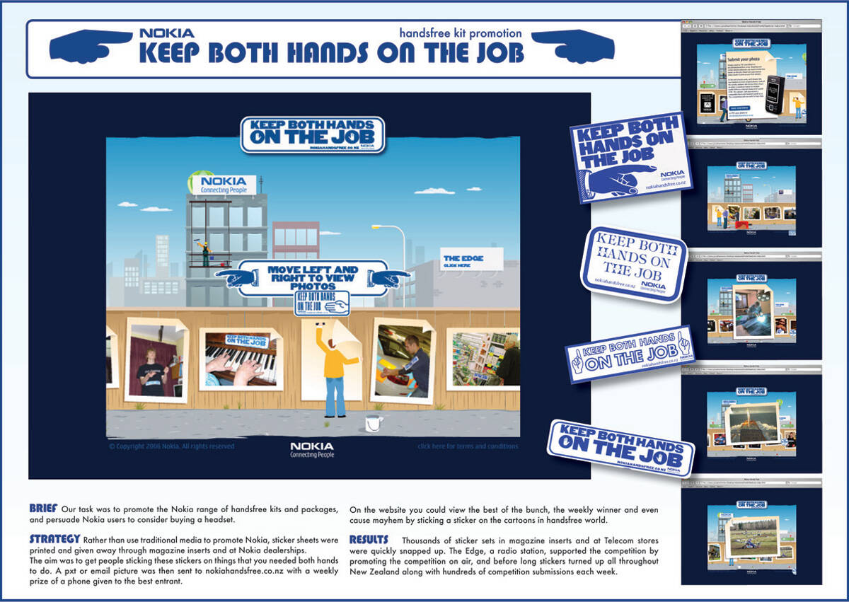 This professional campaign titled 'Handsfree' was published in New Zealand in June, 2008. It was created for the brand: Nokia, by ad agency: Y&R. This Ambient medium campaign is related to the Electronics, Technology industry and contains 1 media asset. It was submitted over 17 years ago.