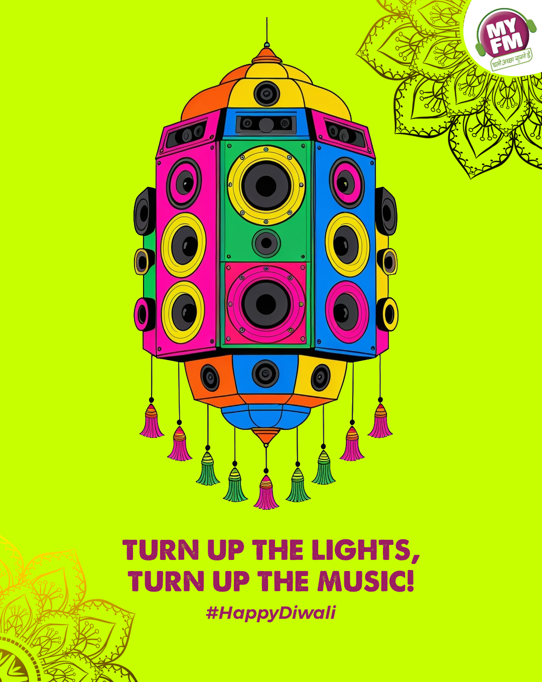 This vibrant visual reimagines the traditional Diwali lantern (akash kandil) with a playful MY FM twist — transforming it into a colorful speaker lantern, blending light and sound to symbolize joy, festivity, and celebration.