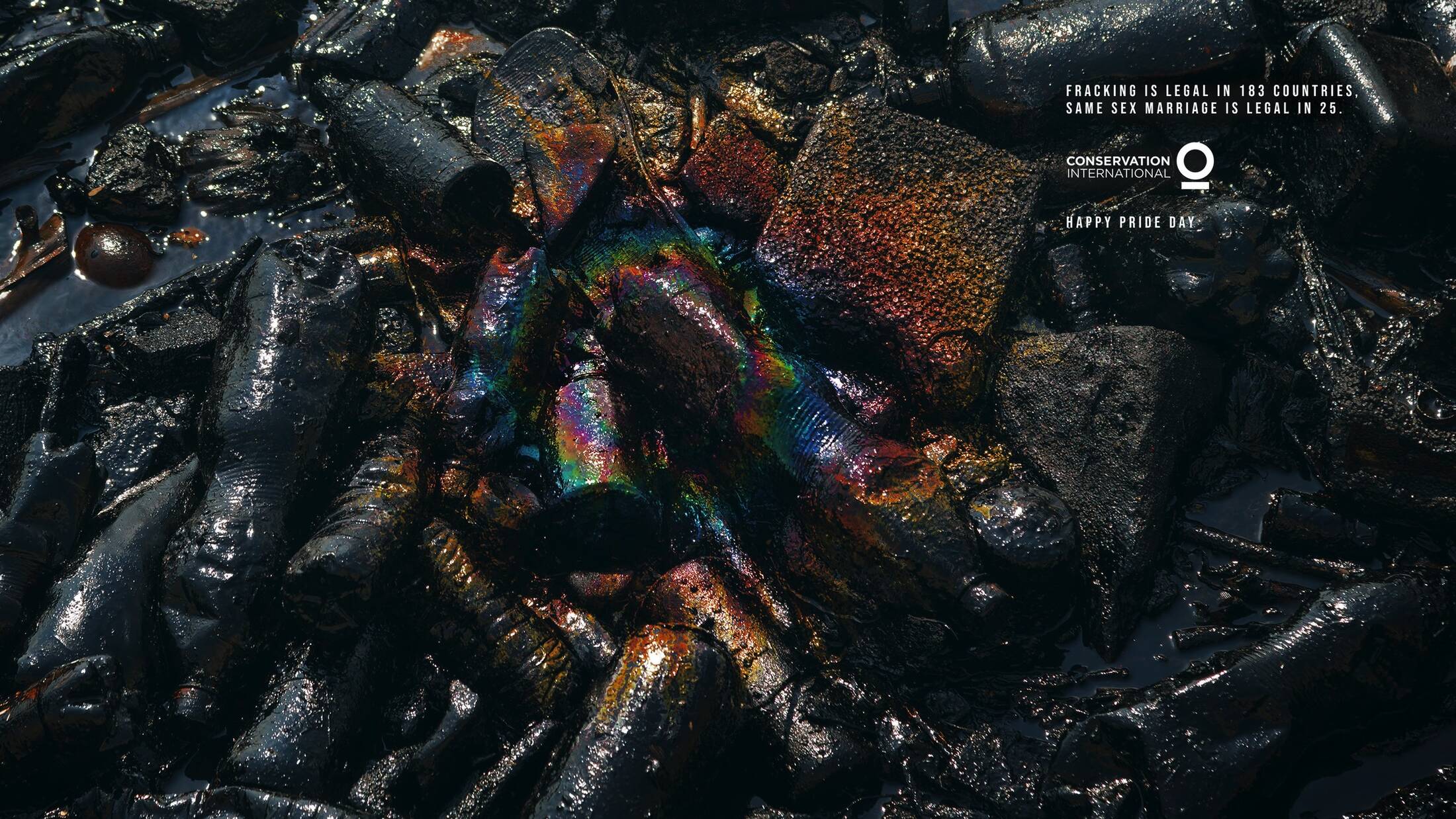 Conservation International is an organization that works for keep the natural environment and natural resources, their messages have inspired the people for the care of the planet and in this case one of the problems that represents inequality around the world: the same sex person marriage. That's why for the International pride day we want to show the fracking effect on the ground, this contaminated ground has the same colors that the gay flag. In that way the world will know that we have a lot of fights to give and many to win for the planet: the dignity and equality.