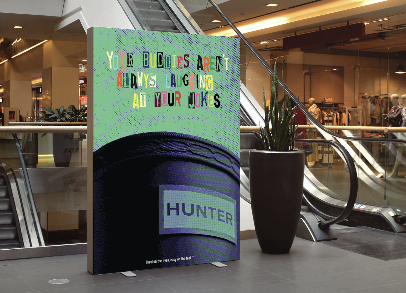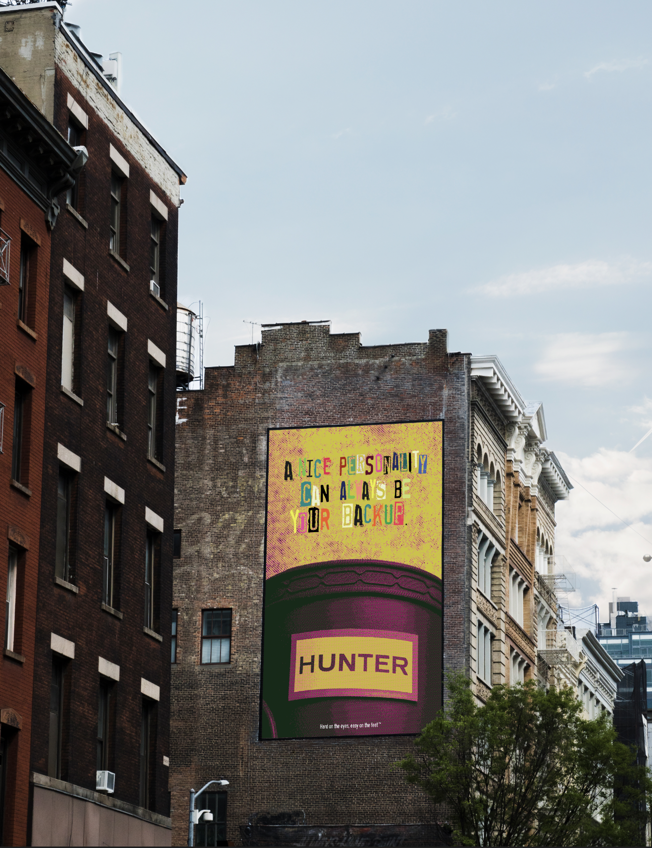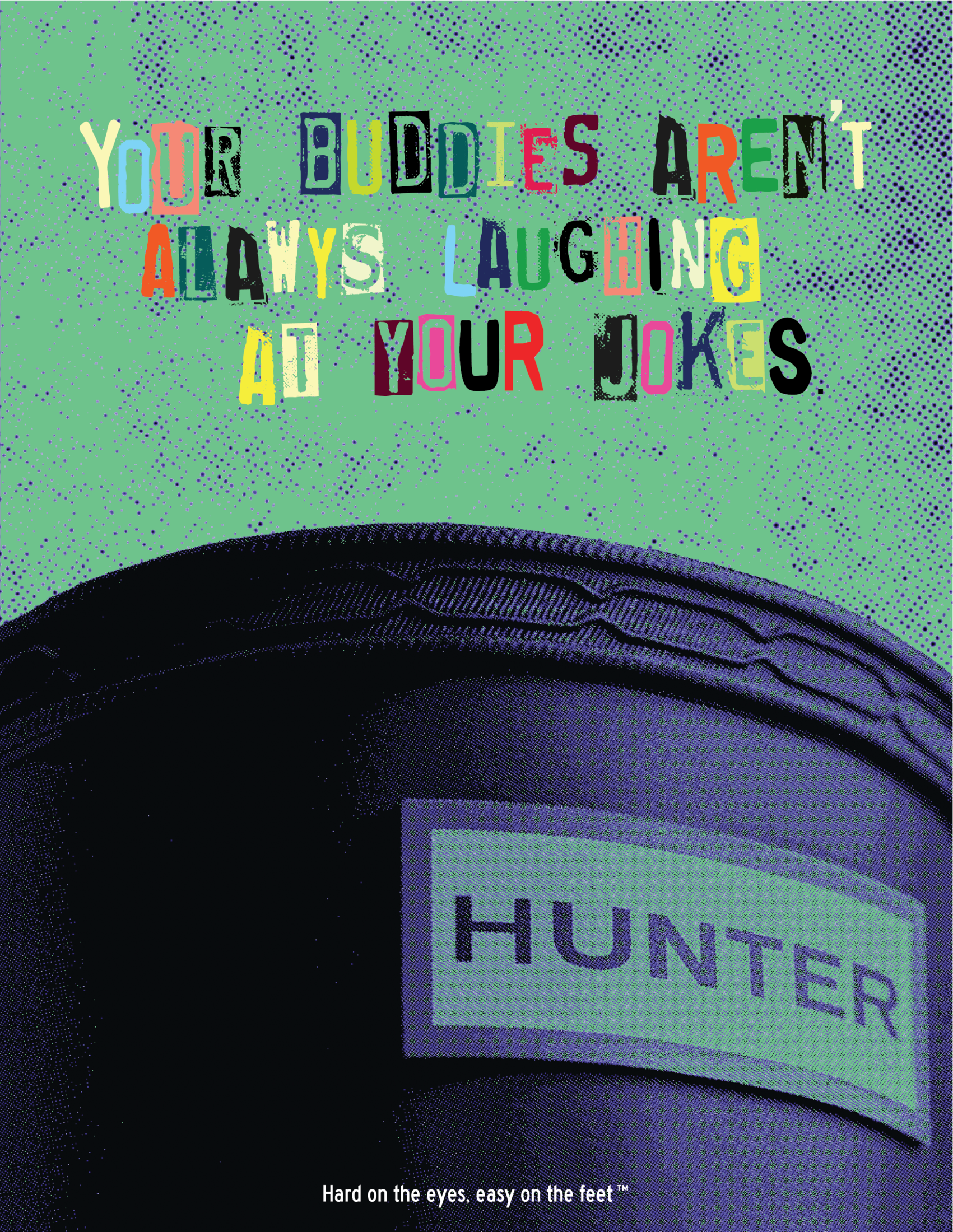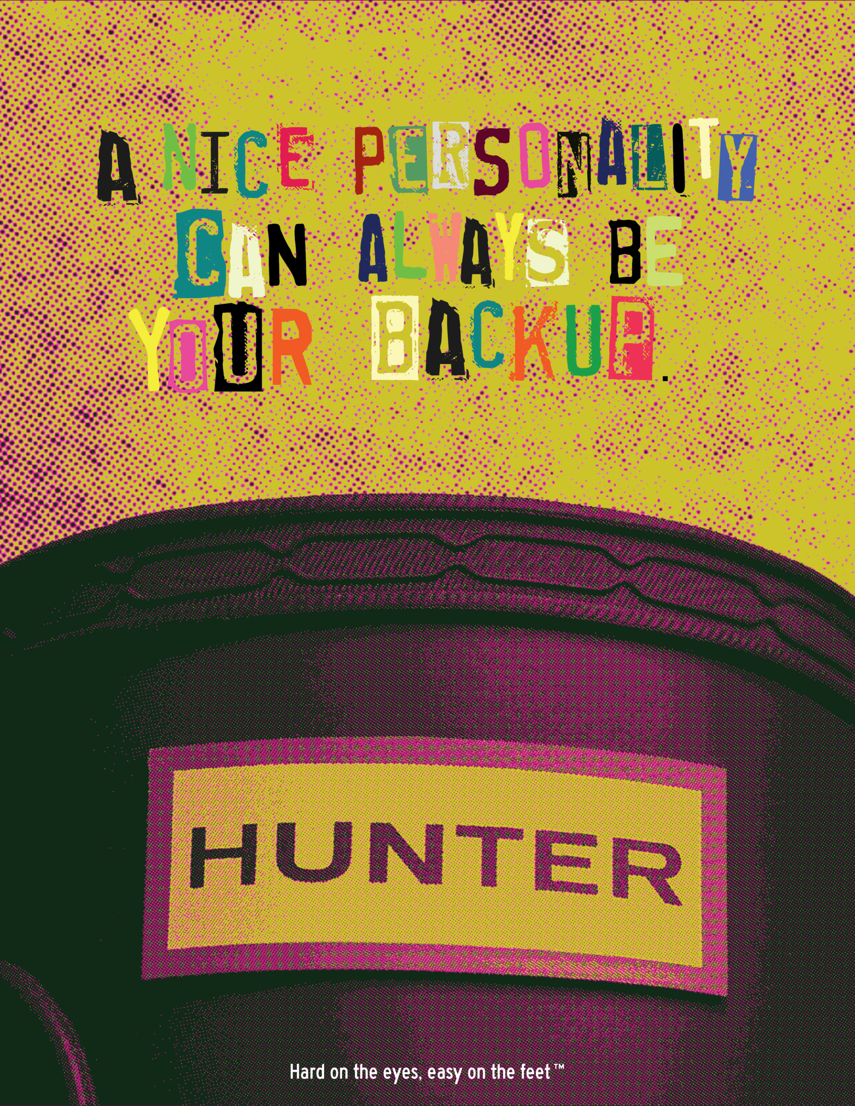 This student campaign titled 'Hard on the eyes, easy on the feet' was published in United States in September, 2024. It was created for the brand: Hunter Rain Boots, by ad school: The University of Alabama. This Design and Print media campaign is related to the Fashion industry and contains 6 media assets. It was submitted about 1 year ago by Art Director/Graphic Designer: Sydney Smith.