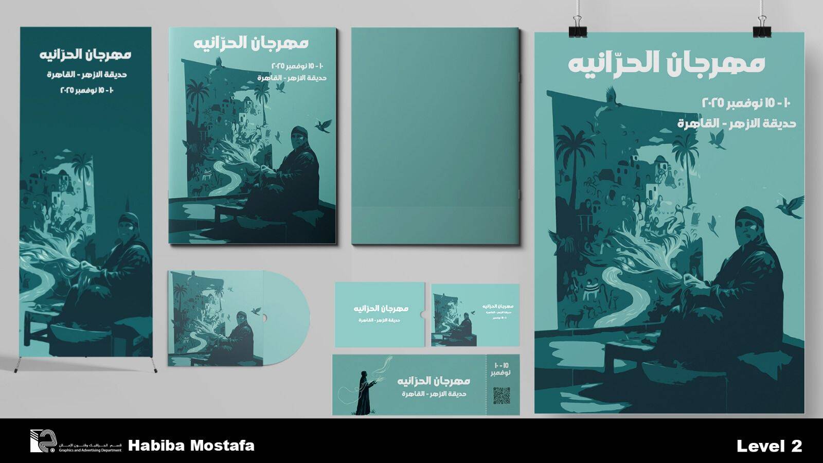 Using a monochromatic teal color palette, the design bridges the gap between ancient Egyptian craft and modern visual identity. The campaign includes a full branding suite (Posters, Roll-ups, Tickets, and Digital Collateral), all designed to invite the modern audience to appreciate the patience, art, and heritage of Harrania’s weavers.